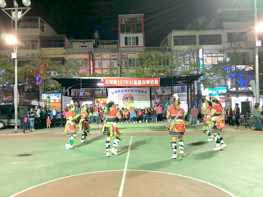 金湖鎮公所近日舉辦「金湖鎮107年社區嘉年華活動」,邀請鎮內各社區媽媽還有其他團體一起在新市里籃球場表演,吸引民眾觀賞,表演內容包括原住民舞蹈、土風舞、民俗舞蹈等,十分多元。金湖鎮長蔡西湖表示,鎮公所重視中老年人健康和運動促進,在金門步入高齡化社會,是期透過社區多辦健康促進活動,來增進中老年人身體健康。 金湖鎮公所舉辦金湖鎮107年社區嘉年華活動,邀請各社區居民共同參與,並提供社區展現才華與才藝表演的舞台,結合健康促進活動的概念,藉此機會提供社區互動的機會。 107年社區嘉年華活動在新市里籃球場舉行,邀請各個表演團體接力演出,包括原住民舞蹈、湖前社區媽媽表演茶山情歌和癡情玫瑰花、山外社區表演一起走天涯、塔后社區表演一萬個對不起、新市社區表演桃花鄉以及國標舞和土風舞等,多達9個團體不同演出,炒熱現場氣氛。 金湖鎮長蔡西湖表示,鎮公所重視中老年人健康和運動促進,在金門步入高齡化社會,是期透過社區多辦健康促進活動,來增進中老年人身體健康。蔡西湖稱讚社區媽媽的服務工作表現,是志工們的模範,「志願服務工作」是社會一股正義的力量,期盼更多人投入志願服務行列,一起來協助、照顧、關懷弱勢族群,雪中送炭比錦上添花更有服務價值的意義,讓社會更溫馨、祥和。