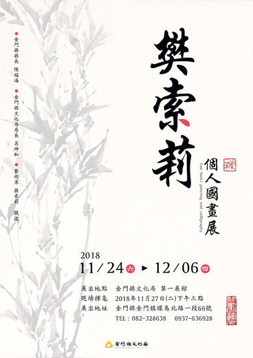 樊索莉個人國畫展自今日起至12月6日,於金門縣文化局第一展覽廳展出,並於27日下午3點舉辦現場揮毫,竭誠歡迎舊雨新知以及對國畫藝術有興趣的賢人雅士、父老鄉親們蒞臨指導與欣賞。 樊索莉,1963年生於河南鄭州,號竹裡館人。自幼深受其父樊廷瑞影響,酷愛書畫,四歲起毛筆習畫,結業於中國藝術研究院花鳥研究生班。現為河南省美協會員、中國書畫家協會會員、新時代藝術名家雜誌社簽約藝術家。現任中國書畫藝術名家聯合會副會長,中國古今文化研究院、華夏書畫研究院副院長。稱得上是一位根基深厚的書畫藝術家。 樊索莉幼年師從曹新林老師;少年師從謝冰毅、劉貴翹先生;青年起著意研究寫意墨竹,常觀摩眾大家作品,汲眾家之長化為己韻,尤擅董壽平之意,其意境大氣高雅,筆墨酣暢,素有「女壽平」之雅稱。她的墨竹多為寫意之作,一氣呵成。她自創的雪竹挺拔昂揚,迎風浴雪,不畏嚴寒地挺立,使作品傳遞出一股積極向上的生命活力和進取精神,被譽有「壽平精骨、板橋風韻」!她筆下的花鳥都有種蓬勃的朝氣,觀她的花鳥作品,會被畫面所呈現的氣韻深深吸引,有種清新的力量把觀者包圍。 她的作品深受藏家喜愛,多幅作品被海外華人及國內文化機構、企業家收藏。2013年獲得由新華網主辦的「2013年度收藏人物評選」,活動中獲得「2013中國最受收藏界關注藝術家」獎項。 就在偶然的機緣下,樊索莉陪同母親蒞金探親,舅舅乃梁振瑛先生(現居住於金湖鎮武德新村,軍旅生涯後外調,曾擔任過金門自衛總隊副總隊長、育幼院院長、花崗石廠廠長、安老院院長……等),因緣巧合參加了文化局畫展開幕儀式而萌生了在金門辦一場畫展的念頭,隨即呈上個人畫冊,博得局長呂坤和的青睞而有了此次畫展的舉行,希望藉機與在地文人雅士相互切磋、觀摩、交流。 11月24日起將作為期兩星期的展覽,希望有興趣的鄉親們把握這難得的機會前來欣賞,同時涵養身、心、靈,提昇精神上另一層次的高遠境界。