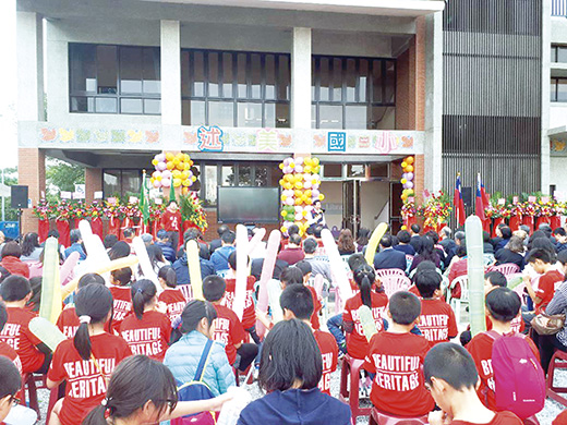 述美國小3日舉辦建校95週年校慶,同時舉行新建「圖書視聽專科大樓」剪綵儀式,新大樓包含設備完善動靜皆宜的城堡圖書館、超大彩屏螢幕階梯視聽教室、直錄播視訊多功能專科教室、地下室避難空間及學校廚房及餐廳等,設備十分完善。 校慶活動由述美國小幼兒園揭開序幕,由陳高馨老師指導彩虹班學生以節奏鼓方式繞行進行馬上變換成桶鼓表演,一首男兒當自強敲出典禮的活力與熱情,緊接著是彭康順及洪宇樊老師指導學校跳鼓陣表演,除了陣型變化團隊的協調外,一曲熱情的沙漠更炒熱整個會場。 縣長陳福海致詞表示,肯定學校的努力及近年來的表現,縣政府會全力支持學校的教育,投資教育就是投資未來,同時感謝國際扶輪的參與及學校校友會、家長會與學校志工媽媽的幫忙,促成述美國小校務運作的優異表現。福建省政府秘書長翁明志也帶來祝福與道賀,說明中央對學校教育投資的實質投入與正面態度,希望提供學校優質的教學空間與場域。張光海名譽理事長、李應文理事長及陳玉珍議員也都相繼道賀祝福述美國小95週年生日快樂。 述美國小特別致贈感謝狀感謝國際扶輪3481地區第三分區聯合服務溢助經費提供學校校務推動及圖書館的空間營造,其中金門扶輪社現任社長陳忠輝是述美國小畢業的校友,也以學長的身分帶來滿滿的祝福。 典禮重頭戲是新建「圖書視聽專科大樓」剪綵儀式,學校特別花盡心思,改變以前傳統長官剪綵,而其他觀禮人員及學生只有負責鼓掌的模式,爆破大氣球、彩花拉炮及棒狀長型聲音汽球分發在場每位成員,每個人都是剪綵貴賓,在司儀倒數之後,大氣球內的氦氣小球、彩帶及長型氣球飛滿天空,大氣球爆炸聲、拉炮彈出聲音及長型氣球飛行的聲音畫破天際,整個會場充滿掌聲、驚呼聲,活動場面熱鬧致極。緊接著學校各班在班級內擺設園遊會攤位,有學生攤位、愛心志工隊攤位、家長會攤位、在地產品攤位等,參與家長、學生、師長及參觀人士熱情參與,將活動帶至另一段高潮,整個校園瀰漫著校慶及校舍啟用的歡樂氛圍。 述美國小表示,在創校95週年這個特別的日期,在各界的支持下述美國小完成圖書視聽專科大樓的新建,用這個最好的禮物來慶祝述美國小95週年生日快樂,這棟校舍在黃奕展校長及王任益校長擔任校長期間即開始努力與規畫,然而施作過程命運乖舛,最後是在縣長大力幫忙及教育處、工務處、國際扶輪社、建築師及廠商的通力合作下,於今年1月29日完工,緊接著配合裝修工程讓校舍更趨完善。 述美國小圖書視聽專科大樓,總造價金額約3900萬元,中央款1500萬、金門地方教育發展基金2400多萬元,包含設備完善動靜皆宜的城堡圖書館、超大彩屏螢幕階梯視聽教室、直錄播視訊多功能專科教室、地下室避難空間及學校廚房及餐廳等。學校後續仍有運動場跑道即將完工,規畫4線道跑道、1道硬鋪面滑冰道、跳遠場、鉛球場地等,由許義翔建築師設計監造、佳和營造謝宗宏老闆承攬,讓學校整體教學環境及設施更佳完善。 述美國小前身創立於民國12年金門第十二小學,期間因抗戰停辦,民國35年地方熱心教育人士籌資創設「私立官山小學」後奉令改為「官澳國校」,民國48年青嶼國校與官澳國校合併改名「官嶼國校」,民國55年再與「西園國校」合併,西園另設分校,民國59年新校舍落成遷入現址,孟述美將軍當時擔任金門防衛司令部副司令官,故本校奉令校名改為「述美國小」,並在當時令文中說明述美二字含意為紹述盡美的意思,述美國小校慶服裝就是以此別具意涵的概念製作。