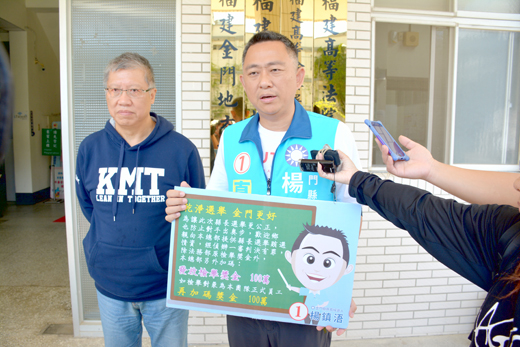 記者楊水詠/金城報導 金門縣五合一選舉進入決戰關鍵十八天!中國國民黨金門縣長候選人楊鎮浯昨(五)日拜會金門地方檢察署表達支持檢方查察賄選作為及決心,並宣布除了政府賄選檢舉獎金,再加碼新台幣一百萬元,如遭檢舉者確為自己陣營人士,又再加碼一百萬。另,楊鎮浯亦要求對手就民眾所關心的「金酒東北試釀案」公開辯論,把真相還給金門老百姓。陳福海競選團隊回應,陳福海不僅在下鄉拜票時向選民一一說明,也透過記者會與地檢署不起訴書來說明過程;若是要辯論,包括陳福海提出新三通、十大建設等劃時代內容,也希望楊鎮浯能多針對政見提出論述,共同為金門鄉親營造更美好的未來。 楊鎮浯是於昨天上午十時三十分左右,由國民黨金門縣黨部主委林芳旋等人陪同,到地檢署拜會檢察長毛有增,要求加強查賄並防止栽贓,還包含許多的選舉奧步,也希望地檢署針對這一個區塊能夠多所著墨,並感謝檢警調同仁在整個選舉期間的辛勞。 楊鎮浯有感於地區很多有關選舉傳言甚囂塵上,很多鄉親對地區選風也都滿憂慮的。而且,他相信民主選舉是要透過公平公正公開機制,選出心目中最理想的候選人,而不是讓惡質的選風來影響整個選舉的結果。 楊鎮浯競選總部也加碼只要向楊鎮浯總部來提出檢舉,就像法務部檢舉流程一樣,經司法機關判決一審有罪,楊鎮浯競選總部加碼一百萬元作為查賄獎金。同時,如果檢舉對象是屬於楊鎮浯所有工作同仁的一份子,我們另外再加一百萬,來向社會宣布我們堅決反賄選的一個決心。 檢察長毛有增表示,這次選舉,立案案件比上一屆(四十八件)還多,地檢署有自己查察賄選的進度;目前,選他案將近五十件、選偵案目前有一件,也會積極查察,防制暴力賄選、金錢介入選舉,務必讓選舉公正公平公開來舉行。 楊鎮浯也針對各個其他對手陣營來提醒鄉親,最常看到的選舉奧步,現在很多都已經出現,包括設局嫁禍買票、人為車禍、下跪悲情、舉報假案、佯裝被攻擊、發布假民調、假冒不同陣營發布不實訊息、糾眾抗議陳情、發布假約談、開票匭變造票數,這些都是大家比較常看到的奧步。 楊鎮浯說,選舉不同的陣營有各自不同的論述,但選舉到今天還沒有看過這麼直接用別人的名義去發布假政策來誤導選民。 針對網民利用候選人照片誤導選民,是否構成違法?檢察長毛有增表示,若候選人認為構成犯罪嫌疑,並提出具體犯罪事證,檢方會依法積極來偵辦。 楊鎮浯亦表示說,願就大家所關心的金酒東北試釀案公開辯論,把話講清楚,把真相還給金門的老百姓!陳福海競選總部回應指出,陳福海不僅在下鄉拜票時向選民一一說明,同時我們也透過記者會與地檢署不起訴書來說明過程,請楊先生上網google搜尋或是在陳福海臉書粉絲團也能找到。 陳福海競選總部說,我們認為競選核心應該回歸政績與政見的論述來爭取鄉親的支持,如果只想用抹黑污衊負面文化來操作選舉,卻拿不出具體政績,恐將讓浯島善良純樸遭到破壞。 陳福海競選總部指出,我們歡迎所有鄉親共同來檢視政績,將雙方擔任立委的成績拿出來比較,陳福海還曾獲得立院優質立委的肯定,此外陳福海就任縣長以來不僅完成通水、電力強化、指標道路拓寬等政績,目前同時也有一百多項政策與工程正在推動,未來幾年都會逐步落實完成。 此外,楊鎮浯於昨天拜會地檢署檢察長毛有增要求加強查賄並防止栽贓,以及在地檢署一樓召開反賄選反奧步反栽贓記者會後,楊鎮浯也到浯島城隍廟上香,宣示乾淨選舉金門更好!