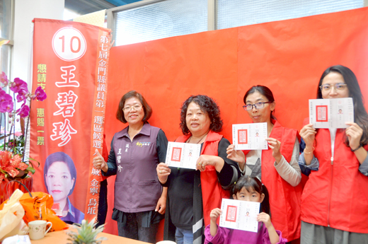 連任兩屆縣議員的王碧珍,八年來不遺餘力爭取嬰幼兒優惠政策、推動保母專業證照化,並爭取老年及殘障等弱勢權益,王碧珍很欣慰提出的政見都有兌現,她很感謝鄉親的支持,繼續尋求三連任。王碧珍說,這些年來她沒有忘記對鄉親的承諾,堅持「清新、清廉、優質、熱誠」的問政服務理念,就是希望能有再次為鄉親服務的機會。 王碧珍的勤快、熱誠,讓選民看到行動力的競選服務處,王碧珍說,8年前受到鄉親支持,她才有機會進入縣議會為大家服務,始終以感恩的心,戰戰兢兢落實服務,信守對選民的承諾。 現今家庭結構轉變,雙薪家庭面對工作和托育的兩難,多選擇保母代為照料小孩。王碧珍不僅長期關注安全托育,也認為專業保母的必要性,督促縣府推動保母專業證照化及嬰幼兒照顧津貼等優惠政策,並爭取在金門設立托育人員考場,她並熱心成立嬰幼兒托育協會,聚合更多的合格專業保母,來提升金門安全托育的環境,確保托育品質。 王碧珍在爭取老年及殘障等弱勢權益,也投入很多心力,為他們爭取應有的權益,督促縣府加強該區塊的照顧和福利,改善他們的生活。在小三通優惠政策上,也有所成果,包括,爭取簡化入境手續、以及落地簽證、調降船票票價,希望有更多旅客入境,為金門帶來更多觀光效益。在道路的整建綠化,也看到縣府努力的成果。 王碧珍說,兩屆任內所提出的政見議題,都有獲得改善,這一屆的競選訴求,她持續關注的議題包括有,繼續爭取老年及殘障等弱勢權益、全力爭取女性問政機會,爭取性別平等;落實小三通優惠政策,爭取陸客來金觀光,帶動地區繁榮;督促縣府整建全縣主要道路,以維人車安全;全力爭取嬰幼兒優惠政策;全力爭取婦女就業機會;金門擁有豐富的海岸觀光資源,規劃闢建濱海道路,能串聯、整合濱海鄉鎮,發展沿海觀光資源,藉此帶動海岸發展,吸引觀光客遊憩、飽覽優美海岸景緻。 王碧珍懇託鄉親的支持,讓她繼續在議會「發聲」,爭取改善政策。