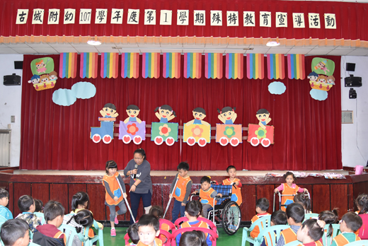 古城國小附設幼兒園辦理「認識你真好,有愛無礙」特殊教育宣導活動。運用「讓愛飛揚,你可以再靠近一點--肢體障礙篇」影片觀賞及體驗活動與團體討論等方式,讓小朋友感受身障者的生活處境和我們不同之處,以及身障者在生活上可能遭受的不便,激發小朋友珍惜自己健全的身體,進而幫助他人,增進幼兒對身心障礙者的了解、尊重及接納。 這場活動由校長楊成業主持,金水分班呂文珠老師策劃。 文珠老師開場坐著輪椅進入會場,進場的小朋友看到坐著輪椅的文珠老師,馬上幫忙推輪椅,看到幼兒主動助人的舉動讓老師感動不已。 在「用手取物體驗活動」,幼兒戴上手套模擬肢體障礙者,利用受傷的單手抓取桌上的錢幣疊高高,每位幼兒都使盡全力靠著戴手套的手指拿取錢幣,有的小朋友輕而易舉,有的小朋友費了很大功夫才將錢幣拿起來。藉由身障體驗活動中,讓幼兒學會體悟身心障礙者的不便,從而啟發幼兒學習了解、尊重、接納以及友善對待身障人士的態度與行為。
