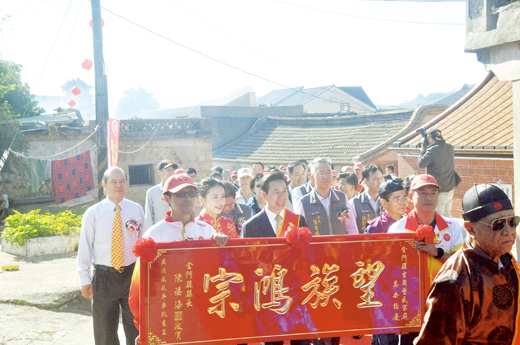 金門縣金城鎮古崗董氏家廟昨(廿九)日起一連舉行三天的奠安慶典活動,縣長陳福海、議長洪麗萍與地區鄉鎮長及立委楊鎮浯團隊均前往敬祭,並獻上匾額,祝禱董氏裔孫在先人福蔭,人丁旺盛,福澤綿長。各界來賓、姻親組祝賀團道賀,董氏家廟內香煙繚繞、「人氣十足」,鞭炮聲響個不停,整個古崗村落,洋溢著喜慶的熱鬧氣氛。 金門縣金城鎮古崗董氏家廟奠安慶典活動自昨日凌晨起鼓、法奏揭開序幕,熱鬧展開一連三天的慶典活動,古崗董氏宗親並由奠安委員會帶領宗親組成迎賓隊伍,在鞭炮聲中,熱誠的歡迎來賓以及姻親的逗熱鬧,相當熱鬧,也讓來賓以及各地宗親感受到董氏宗親擺出的歡迎陣仗場面,各式中堂、匾額掛滿家廟,祭拜供品也滿滿排上兩桌,董氏宗親都以辦喜事的心情參與慶典活動,緬懷祖德的庇祐。 昨日上午九時許縣長陳福海帶領縣府各處局主管前往古崗,董氏迎賓隊伍已在村公所前廣場等候迎接,陳縣長等人從村口步行到村內的董氏家廟,沿途中受到董氏長老、村民與古城國小鼓陣熱情歡迎。 祭典儀式中,陳縣長遵循古禮儀式上香、獻果、獻饌、獻花、獻金帛等,並敬獻「望族鴻宗」大紅匾額及爐敬金,祝禱古崗董氏裔孫在先人福蔭,人丁旺盛,福澤綿長,場面莊嚴肅穆。陳縣長頻頻向在場董氏宗親及長老道賀。議長洪麗萍於上午近十時許偕同議員許華玉、李誠智、王碧珍及議會總務主任陳建興、會計主任汪秋明等前往敬祭,同樣受到熱烈的歡迎,洪議長遵循古禮獻敬,並以「敦宗睦族」賀匾及爐敬金,表達祝賀。金城鎮長石兆■偕同烈嶼鄉長洪成發、金寧鄉長陳成勇、金湖鎮長蔡西湖、金沙代理鎮長蔡其朝等團隊遵循古禮上香致敬,並獻上賀匾及爐敬金表達祝賀,村落洋溢著喜慶的熱鬧氣氛。 上午迎接陳氏姻親所組成的慶賀團,浩浩蕩蕩抬著各種牲禮前往慶賀儀式,四起的煙硝、鞭炮和沸騰的人聲,更是掀起活動的高潮氣氛。來自各地的董氏族人也絡繹不絕的攜家帶眷到祖廟祭祖,禱佑闔家平安,家廟內沸騰的人聲和鞭炮聲,渲染慶典的最熱鬧高潮。奠安委員會也依傳統家廟慶典風俗,邀請戲劇團演出,吸引社區民眾扶老攜幼前往觀賞。 一整天,家廟內進行醮慶,鞭炮聲響個不停,讓慶典十分熱鬧。奠安委員會也於昨日中午辦桌宴請姻親與祭祖團,聯絡情誼,場面極為融洽。今(卅)日的活動安排進表、排粿粽、迎接董楊宗親代表及金門各地的宗親也會前往祭祖,弘揚祖德。下午歡送各地宗親、犒軍、插柳、淨油、安磚契、晚間關家廟門。最後一天啟扉、請玉皇大帝、獻供、宗親祭典、送玉皇大帝、分燈、戲劇公演等。