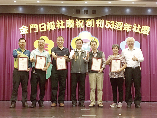 金門日報53歲了!本報昨日慶祝創刊53週年社慶,頒獎表揚資深績優員工,也邀請歷任社長及老員工歡聚共同慶祝。縣長陳福海、副縣長吳成典、副議長謝東龍等人皆到場致意,祝賀報社53歲的生日,同時嘉勉員工平日的辛勞。 社慶活動昨日中午假迎春閣餐廳舉行,縣長陳福海、副縣長吳成典、副議長謝東龍、議員歐陽儀雄、李應文、陳滄江等人到場致賀。本年獲資深績優員工計有服務年資45年的陳能英、蔡天禮、服務年資40年的陳建國、服務年資35年的翁維智、莊煥寧、李增汪、黃堅堯、陳德鵬、李增我。由副縣長吳成典頒獎表揚。全體員工並和嘉賓齊唱生日快樂歌及切蛋糕。 縣長陳福海、副縣長吳成典、副議長謝東龍、議員陳滄江、歐陽儀雄、李應文先後上台致詞,除了祝賀報社生日快樂外,也對報社員工的辛勞及貢獻,均表示肯定與支持。 金門日報前身為「正氣中華報」,民國三十七年創刊於江西南城,民國三十八年十月時隨國軍遷到金門,民國五十四年十月三十一日金門日報創刊與正氣中華報採雙報並行出刊。民國八十一年十一月七日,金門終止戰地政務,正氣中華報歸屬金防部,改以週報對軍中發行,金門日報則改隸屬金門縣政府,繼續對軍民發行。