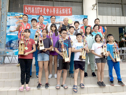 金門縣107學年度中小學游泳錦標賽,日昨假金寧中小學游泳池展開國小及國、高中賽程,分個人及團體賽,吸引地區中小學各級學校游泳好手報名競技,比賽成績揭曉,各組總錦標賽分別由金門高中、金城國中、中正國小獲得,縣府教育處長李文良等人頒獎表揚各組績優。 由金門縣政府主辦,中華民國游泳協會、金門縣立體育場、金門體育會游泳運動委員會承辦的「一○七年度金門縣中小學游泳錦標賽」,於日昨上午九時起,在金寧中小學游泳池展開競技,金門縣教育處處長李文良、議員陳滄江、金門體育會游泳運動委員會主委陳金福及各校校長、教練等人到場為選手加油。參賽項目分別有高中(職)、國小、國中等學校,分為男子組及女子組的五十公尺的蛙式、自由式、仰式、蝶式比賽、一百公尺自由式接力、兩百公尺自由式接力等項比賽。選手卯足全力爭取佳績,經過一番激戰,各組成績揭曉。 這項競賽各組總錦標賽成績:高中組第一名金門高中。國中組第一名金城國中、第二名金湖國中、第三名金寧中小學。國小組第一名中正國小、第二名金鼎國小、第三名上岐國小、第四名賢庵國小、第五名金湖國小、第六名何浦國小。 50M自由式國小女第一名金鼎黃畇溱、第二名中正廖千媛、第三名中正許沛庭。國小男第一名中正吳宇棠、第二名中正李宸佑、第三名金鼎黃弈捷。國中女第一名湖中袁希婷、第二名城中蔡侑岑、第三名湖中楊可欣。國中男第一名城中李宥德、第二名寧中吳亭佐、第三名沙中張皕翔。高中女第一名金中方岑、第二名農工陳思涵、第三名金中陳曦。高中男第一名金中吳亭佑、第二名金中王昱傑、第三名農工張韋晟。 50M蛙式國小女第一名中正張沛羽、第二名中正陳品妤、第三名上岐洪妤瑄。國小男第一名中正吳宇棠、第二名中正李宸佑、第三名中正廖昱。國中女第一名城中蔡侑岑、第二名沙中王晨恩、第三名烈中方宜凡。國中男第一名城中吳家安、第二名湖中黃乙恩、第三名城中林伯謙。高中女第一名金中陳又禕、第二名金中陳曦、第三名金中蔡依辰。高中男第一名金中莊子毅、第二名農工黃星育、第三名金中吳燦霖。 100M自由式國小女第一名金鼎黃畇溱、第二名中正廖千媛、第三名中正許沛庭。國小男第一名中正蔡秉均、第二名金鼎黃弈捷、第三名中正吳宇棠。國中女第一名湖中袁希婷、第二名城中吳孟甄、第三名湖中宋劭婷。國中男第一名城中李宥德、第二名寧中吳亭佐、第三名沙中張皕翔。高中女第一名金中翁綺霙、第二名農工陳思涵、第三名金中陳又禕。高中男第一名金中吳亭佑、第二名農工張韋晟、第三名農工何英震。 100M蛙式國女組第一名湖中袁希婷、第二名城中陳語蕎、第三名沙中王晨恩。國中男第一名城中吳家安、第二名湖中黃乙恩、第三名城中林伯謙。高中女第一名金中陳又禕、第二名金中許云謙、第三名農工張苡恩。高中男第一名金中莊子毅、第二名農工黃星育、第三名農工蔡育寧。 50M蝶式國小女第一名金鼎黃畇溱、第二名中正陳品妤、第三名中正廖千媛。國小男第一名中正李宸佑、第二名中正吳宇棠、第三名中正蔡秉均。國中女第一名城中吳孟甄、第二名城中蔡侑岑。國中男第一名城中吳家安、第二名寧中吳亭佐、第三名城中林伯謙。高中女第一名金中方岑。高中男第一名金中莊子毅。 50M仰式國小女第一名金鼎黃畇溱、第二名中正廖千媛、第三名中正許沛庭。國小男第一名中正李宸佑、第二名金鼎吳奕捷、第三名中正蔡秉均。國中女第一名城中袁希婷、第二名城中吳孟甄、第三名蔡侑岑。國中男第一名城中李宥德、第二名寧中吳亭佐、第三名城中張佑安。高中女第一名金中方岑、第二名金中蔡依辰。高中男第一名金中吳燦霖、第二名金中李定軒。