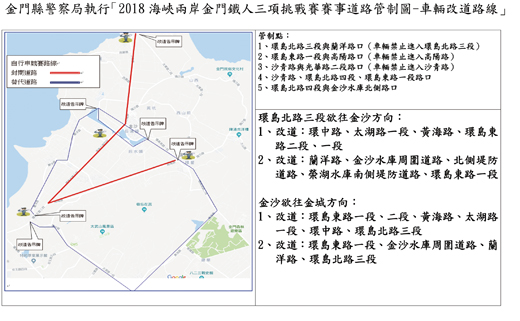 2018海峽兩岸金門鐵人三項挑戰賽,將於明(27)日上午7時至12時30分假官澳龍鳳宮舉辦,包括國內及廈門男、女鐵人三項好手都將來金門參與這項盛會,角逐總獎金30萬元比賽。主辦單位金門體育會也針對賽會地點規劃交通維護設施,並請鄉親屆時配合賽會交通管制疏導,以確保賽事順利進行。 金門體育會指出,本次鐵人三項挑戰賽中好手聚集,男子選手有林威志(參考佳績為1小時47分13秒)、張家豪(參考佳績為1小時48分)、謝育宏(參考佳績為1小時54分30秒)、邱韋強(參考佳績2小時58秒),金門在地好手黃世昌為2小時7分56秒,女子選手張嘉家則擁有國內女子最佳成績2小時4分48秒,更有廈門來的鐵人三項好手,競爭激烈可期。 為了保有賽會秩序及安全,金門體育會在賽前嚴謹規劃交通維護並申請道路使用路權,以確保比賽順利進行,金門體育會理事長唐麗輝議員並特此呼籲鄉親,屆時請配合賽會交通規劃,共襄盛舉,打造賽會文明品質,如造成鄉親不便,敬請賜諒。 體育會指出, 27日大會比賽時詳細交通規劃如下: 一、07:00~12:30請各旅遊公司,勿安排馬山觀測站、文化園區,西園鹽場景點旅遊。 二、08:20-10:00沙青路、高陽路為自由車賽道,實施封路,而環島北路三、四段則有一半道路管制,來往車輛請改道。 三、10:00-12:00光華路一、二段,沙陽路為路跑賽道,將實施交通管制,來往車輛請慢行,禮讓選手。 四、17:00-20:30官澳海堤路辦理「魅力金門、玩轉金沙」頒獎感恩餐會,海堤路全面封路。 五、08:20~10:00公車路線受影響有5、5A、18A、27、32路5線將暫停載客,請鄰近居民,不要搭車,以免延誤行程。 記者陳冠霖/綜合報導 金門體育會將於10月27日上午7時至13時在金沙鎮舉辦「2018年海峽兩岸金門鐵人三項挑戰賽」,為因應活動可能帶來之人潮與車潮,金門縣警察局金湖分局屆時將於沙青路、環島北路、高陽路及周邊道路實施交通管制工作,以維道路之行車順暢及人車安全,並呼籲行經該路段之駕駛人配合員警或義交人員之指揮。 金湖分局指出,鐵人三項挑戰賽周邊道路交通疏導管制措施如下: 一、道路封閉部分:本次活動屬於競賽性質,且有自行車40公里的賽程,27日上午8時至10時,官澳海堤濱海道路、沙青路(述美國小以南)、環島北路四段(沙青路至蘭洋路口),高陽路全線等均道路封閉,自行車賽事期間禁止一般車輛進入。 二、道路改道部分:(一)、由環島北路欲往金沙方向車輛:建議行駛環中路、太湖路一段、黃海路、環島東路。或行駛蘭洋路、金沙水庫周圍道路、北側堤防道路、榮湖水庫南側堤防道路、環島東路。(二)、由金沙欲往金城方向車輛:建議行駛環島東路、黃海路、太湖路一段、環中路、環島北路三段。或行駛環島東路、金沙水庫周圍道路、蘭洋路、環島北路三段。 金湖分局長張文峰表示,本項鐵人三項賽事已多年未曾舉辦,為考量參賽選手及用路民眾的安全,故有部分道路實施封閉,煩請鄉親予以配合,自行車賽事完畢時,立即解除道路封閉,相關之交通疏導管制措施可於金門縣警察局金湖分局網頁及臉書上查詢,請參加活動民眾事先上網查看,汽、機車駕駛人請聽從警察人員之引導行駛,以維持交通之順暢。