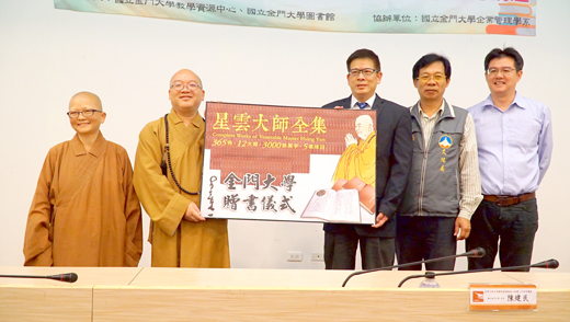 佛光山住持心保和尚昨(二十五)日在金大開講,同時並贈送一套「星雲大師全集」與金大圖書館作為館藏。心保和尚表示,這套著作是星雲大師一生的心血結晶,也是其所提倡「人間佛法」的精華,希望這套全集能成為學子們的人生指引。 金門大學昨日下午二時左右,在金大陳開蓉演講廳舉辦「星雲大師全集贈書典禮暨從心啟動人才培育講座」,佛光山住持心保和尚跨海來金,並在金蓮淨苑主持永勤法師與佛光會成員的陪同下,前往金大進行專題演講,並帶來一套星雲大師著作贈與金大圖書館,由金大校長陳建民代表接受。 感謝佛光山的贈書,充實校內藏書外,也充實學生的心靈糧食,陳建民表示,星雲大學的贈書共三百六十五冊,共有十二大類,三千多萬字,內容集結了星雲大師早年自學到後來的開示演講的內容;星雲大師刻苦耐勞,一身奉獻佛法,陳建民推崇星雲大師注重教育,金門大學獲得贈書,不僅是學生獲益,他也要求圖書館儘快完成編目,星雲大師的智慧分享給所有的金門鄉親。 佛光山住持心保和尚表示,這套全集,是星雲大師一生的著作,佛光山在一九六七年開山,並在二○一七年的五月十六日於佛光山藏經樓舉行「星雲大師全集」的發表會,這套全集共有三百六十五冊,整套書比人還高,更是星雲大師畢生心血,而這套書分為十二大類,不論是經論、教育都有談到。而星雲大師全集自發表以來,也舉辦過多次贈書儀式,送給各學校與單位,並獲得好評。 這套書是星雲大師畢生提倡「人間佛教」的著作集,心保和尚說,佛法在人間,並非只有見諸於寺廟中、禪堂中,更不是僅單純的見於文字之中,佛法是存在於人與人、人與事之間,也在生活、觀念之中體現,因此佛法就是「心中的智慧」。透過星雲大師的闡述,讓大家可以在生活中處處見到佛法光明,也能夠引領人生的一大方向。心保和尚還指出人間是現實的,有煩惱、苦悶,這反映出我們缺少這方面的智慧,若增添了智慧,煩惱苦悶就會減少,因此佛法的智慧可說是人生指引。 並非學佛者才有智慧,人生智慧大家都需要,如此才會不起煩惱,而星雲大師畢生的領悟都可以透過「星雲大師全集」來領略,心保和尚希望透過贈書,並藉此交流,讓佛光山與金門大學日後有多些互動。 除了昨日在金大的專題演說外,心保和尚也於昨日晚間在金蓮淨苑,以「佛法在人間」為題開講,與地區民眾分享佛法的喜悅。