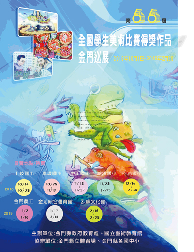 全國藝術饗宴-第66屆全國學生美術比賽優勝作品複製畫巡迴展列車開抵金門!從107年10月1日至108年2月28日長達5個月,將巡迴全縣五鄉鎮展覽,竭誠歡迎各地師生、民眾就近前往參觀。 縣府教育處指出,全國學生美術比賽是國內重要的學生藝術競賽活動,自民國40年創辦迄今已歷66年,是臺灣目前官辦最久的學生藝術競賽,在當時臺灣尚未經濟起飛的40年代,這個比賽首開臺灣學子藝術之風,讓莘莘學子也能一展長才,成為臺灣重要藝術推手,更是國內藝術創作的指標性賽事,每年參與學生人數踴躍,並培育了許多國內知名藝術家,對臺灣藝術教育重要性不言可喻。藝術教育館為更有效提升學生美感,特別透過最新3D科技列印,等比例複製106學年度特優作品,至各縣市辦理巡迴美展。 教育處也表示,本縣雖地處離島,但愛「美」之心不會因地緣的限制而有所減損,除了每年遴選各校優秀作品送至台灣參加全國學生美術比賽外,該處為提升縣內美術教育,接續向國立台灣藝術教育館申請106學年度美感優秀作品,讓縣內學生與家長觀摩提升美的視野! 由國立台灣藝術教育館主辦的105學年度全國學生美術比賽特優作品複製畫巡迴展,去年首度來金巡展,獲得廣大的迴響。今年巡展活動將更深入地區五鄉鎮,期藉著佳作藝術分享軍民學生,助益地區藝術推動發展,提升地方生活水準,激勵學生美術創作意念士氣。 本次展覽計五組82件特優作品,悉來自106年全國學生美術比賽績優得獎作品,由台灣藝術教育館著手複製巡迴各縣市展覽,作品含有繪畫類10件、西畫類10件、平面設計類18件、版畫類13件、漫畫類18件、水墨類13件。 漂洋過海到金門的作品展,將進入本縣七所學校暨金湖綜合體育館與烈嶼文化館作巡迴展覽,歡迎大家共同來參與欣賞這場美的藝術饗宴,展覽地點與時間安排如下: 多年國小:107年10月1日到10月13日。 上岐國小:107年10月14日至107年10月28日。 卓環國小:107年10月29至107年11月12日。 中正國小:107年11月13日至107年11月27日。 湖埔國小:107年11月28日至107年12月15日。 何浦國小:107年12月16日至107年12月30日。 金門農工:108年1月2日至108年1月16日。 金湖綜合體育館:108年1月17至108年2月14日。 烈嶼文化館:108年2月16日至108年2月28日。
