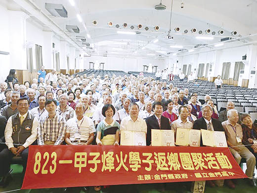 六十年前的十月十日,近千名金門的學生因砲戰而被迫離鄉,在一甲子後的這一天,在金門縣政府及教育處和金門高中的邀請下,老校友們返校團聚,紀念那一段顛沛的歲月,也共敘長久以來的情誼。副縣長吳成典也頒贈感謝狀予到場的六所學校代表,感謝學校當年照顧金門子弟的情義。 為感謝八二三砲戰當時讓金門學子寄讀的情誼,特邀請三十六所學校的校長來金,謝謝因為當年能讓金門子弟們繼續就讀,才能造就日後文教界的金門幫等人才。到場的有六所學校代表,國立高雄海洋科技大學(前身為台灣省立高雄水產職業學校)副校長俞克維、苗栗中學校長黃國峰、嘉義家職校長楊世圳、花蓮高中校長詹滿福、宜蘭高中校長王垠、蘭陽女中學務主任簡森乙。 活動在九月初即募集老金中校友們返校,共吸引了逾一百六十位的校友及眷屬報名參加。活動籌備期間也訪談了幾位砲戰時的老金中校友,如王添富、林水綠、顏重威、黃基礎…等,談談他們記憶中的那段歲月及對小學弟們的期許。活動中所播放的三段影片,呈現出大陸、美國及在地人對於八二三的觀點。金門高中校長廖俊仁表示,礙於因砲戰而到台灣就學的關係人近千無法一一訪談,所需人力資源及經費可能所費不貲,期望能有更多的人以口述歷史、報導文學的方式,記錄下那一段的烽火歲月下生活的人們的情況。 八二三砲戰期間,戰地金門烽火連天,共921位金中的師生被迫遠走異鄉,寄讀台灣各校。民國四十七年十月九日從料羅登船,次日登陸高雄碼頭,隨後分散至台灣的三十六所學校寄讀。在各地學校生活期間,因為校方的幫助才得以延續學業繼續升學,老校友林炳團表示當年寄讀的學校嘉義中學,就是以儲藏室作為他們的宿舍;林水綠表示當年來台後,還到附近的國小重學注音,受到當時寄讀學校老師的鼓勵,之後便報考屏東師範。 活動現場播放的紀錄片中呈現著戰時人們的生活片段,躲砲擊的空檔還是得下田耕種、養豬、洗衣、市集交易。訪談紀錄片中,老校友李福生和林水綠都表示,一聽到砲襲的轟炸聲當即臥倒在田埂裡,有的人甚至跳到井裡,如果砲彈墜地的聲音近就不可以站起來,起來會被砲彈的碎片弄傷。那是一個物質生活拮据的時代,楊忠全說道,當時金門中學有發電機,每天可以發電二個小時,因此他們很珍惜那段有電燈可用的求學生活。八二三砲擊後,到來台就學的這段期間,學生就遷移至現今的陳景蘭洋樓來繼續課業,顏重威回憶當年一群學生從後埔頂著課桌椅走到陳坑。吳成典回憶小時候從烈嶼來金門讀書,就是以校為家,那時還是砲戰延續的年代。 相較於和平且物質生活物不虞匱乏的現在,經歷過烽火歲月的老金中校友們對後輩有著期許,希望年輕人能有世界觀,能有更廣闊的思維。他們表示,當年來台就學,雖說是迫於戰爭,但也因為來台,開啟了他們的思維,更從台灣這一島嶼望眼於世界。因為一個人負笈來台,養成了獨立的個性,他們把吃苦當吃補,深知只有比同儕更努力,才能有所成就。更提醒年輕的世代,不要過度沉迷於手機的使用,雖然手機是時代的趨勢,但是這樣會少了讓思維沉澱的機會。希望大家能不忘「堅苦卓絕、奮發向上」的精神,才能成就榮耀。