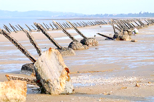 金寧鄉沙崗「安東一營區」海灘的軍事地景軌條砦,疑遭蚵道廠商施工不慎波及,其中幾座軌條砦傾倒、鐵條脫落、倒插,導致防禦景觀出現「破口」;鄉親反映後,金寧鄉長陳成勇表示,鄉公所將要求承包商改善,希望盡快恢復原狀。 在兩岸軍事高度對峙年代,海岸反登陸的軌條砦與雷區、反空降樁並稱金門戰地的三大重要防禦工事,如今隨著兩岸緊張關係緩和,這些被視為冷戰時期的國際級特色地景,已蛻變為當地重要的觀光人文資源,吸引大批中外遊客來到。 據了解,該處海灘曾是1949年古寧頭戰役,國軍和中共解放軍對戰最激烈的戰場,極具歷史意義;但當年爆發「古寧頭戰役」,也是延伸戰場之一的沙崗海岸,卻因安東一營區旁讓蚵民出入的「蚵道」破損,承包修復工程的廠商在作業時,不慎移除破壞數座軌條砦,導致原先串連成排的工事出現大缺口。 金門縣戰地史蹟學會常務理事董森堡也指出,承包商施工時可採更柔性的作業方式,先將妨礙施工的軌條砦吊離,待完成蚵道修復,再放回原地,應不致造成軍事地景的傷害。 金寧鄉長陳成勇表示,軌條砦見證金門從戰爭走向和平,經查廠商進行蚵道施工時,不小心傷到軌條砦,對此,一定會限期要求廠商改善,務期盡快改善和恢復原狀,讓境內戰地史蹟得到最好維護。