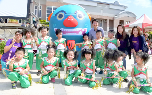 陳麗妤/圖文 金沙鎮2018高粱老街風獅爺文化季,除了系列活動外,金沙鎮公所也特別配合今年積木主角-陽翟會山寺旁風獅爺,打造高2.5米的充氣公子,成為場中另一個注目的焦點,不少民眾,三五好友、親子或闔家紛紛拿起手機或相機捕捉這尊造型風獅爺可愛又討喜的模樣。述美國小幼兒園師生,在表演完「桶鼓」後,也和風獅爺合影留念。