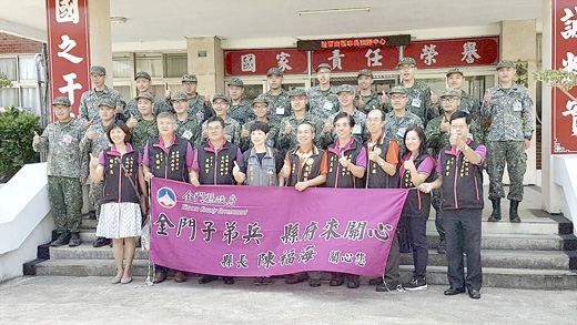 台南市、台南浯江及高雄市、高雄浯江金門同鄉會與金門縣政府南區服務中心分別於10月3、4日,前往台南官田新訓中心及鳳山陸軍官校新訓中心慰問當兵的金門籍鄉親子弟(如圖/南區服務中心提供)。 10月3日金門縣政府南區服務中心主任楊美雪會同台南市金門同鄉會理事長陳瑞華、總幹事楊凱智及台南浯江金門同鄉會理事長翁明恍、總幹事林宗仁等人親赴台南官田新訓中心,慰問於該處接受新訓的家鄉子弟25人。 隔天,楊美雪又會同高雄市金門同鄉會理事長陳德順、幹事許清練及高雄市浯江金門同鄉會理事長黃根寶、總幹事黃國田、理事李寧常、陳明月、董志廉、監事周寶滿等人,前進鳳山陸軍官校新訓中心,慰問於該校受訓的金門籍子弟20人。楊美雪除了代表金門縣長陳福海向受訓學生表達縣政府、縣長對大家的關心與祝福外,也貼心的為縣籍子弟兵帶來咖啡飲料與蛋糕,讓大家解解饞。 在兩中心接受新兵訓練的金門子弟或新金門子弟們,對金門縣政府及旅台金門同鄉會的關懷與關注,都充滿萬分的興奮與感謝! 尤其是高雄市浯江金門同鄉會總幹事黃國田,服務軍旅近三十載,對軍中、學生的需要頗為了解,一早就親赴市場採購新鮮水果,親自清洗、裝切成盒,分送每人什錦水果一盒,主要是為了讓子弟們吃得放心,大家安心,果然受到子弟們的熱烈喜愛,一致認為是大家所需要的精神糧食。 值得一提的是,在交談中,獲知該新訓中心指揮官竟然是金門古寧頭的女婿,也算得上是半個金門人,一切盡在不言中,交流活動愈發顯得格外親切。從交談中,同鄉會一行更知道指揮官是一位充滿愛心、慈悲為關懷、為善不為人知、疼惜子弟的軍官,大伙都為在該中心受訓的金門子弟感到慶幸。 楊美雪主任、陳德順理事長、黃根寶理事長在致詞時,也一致希望大家放下身段、接受訓練、保重身體、為國珍重,將來為家鄉金門貢獻心力,讓金門的未來更充滿希望。