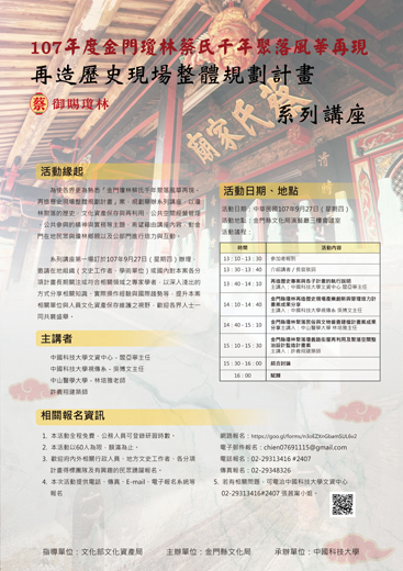 瓊林的現在及未來的規劃如何,為使鄉親參與理解,文化局與中國科技大學合作,將於9月27日假文化局演藝廳三樓舉辦系列講座,歡迎有興趣的民眾報名參與。名額以六十人為限,額滿為止。 為使各界更為熟悉「金門瓊林蔡氏千年聚落風華再現-再造歷史現場整體規劃計畫」案,文化局規劃舉辦系列講座,以瓊林聚落的歷史、文化資產保存與再利用、公共空間經營管理、公共參與的精神與實務等主題,希望藉由講座內容,對金門在地民眾與瓊林鄉親以及公部門進行互動。 系列講座訂於9月27日於文化局演藝廳三樓辦理,邀請參與再造歷史專案之團隊,就執行過程進行成果分享,並以深入淺出的方式分享相關知識、實際操作經驗與國際趨勢等,歡迎各界人士一同共襄盛舉。本活動全程免費,公務人員可登錄研習時數;歡迎府內外相關行政人員、地方文史工作者、各分項計畫得標團隊及有興趣的民眾踴躍報名。 活動報名方式有四種,網路報名:https://goo.gl/forms/n3oEZXnGbamSUL6v2電子郵件報名:chien07691115@gmail.com電話報名:02-29313416#2407傳真報名:02-29348326。若有相關問題,可電洽中國科技大學文資中心02-29313416#2407張茜甯小姐。