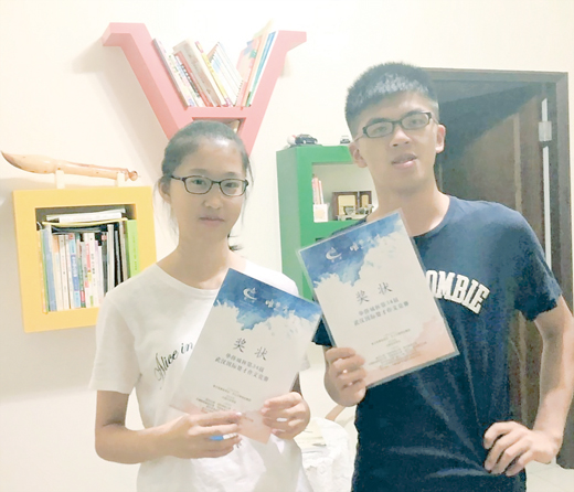 陳丕堯、陳宇彤兄妹檔,是各大作文比賽的常勝軍,也時常投稿本報,今年夏天兄妹一同參與「楚才盃作文第34屆比賽」,在兩萬多位高手中脫穎而出,陳宇彤以「有一種聲音」為題書寫,獲得國中組一等獎;而陳丕堯以「陌生世代」為題創作也奪下高中職組三等獎,兄妹攜手在華語作文比賽中,為金門縣爭得一席之地。 楚才盃作文競賽自1985年開賽以來,今年已進入第34屆,是集世界各地新聞、教育、出版、文化等多家單位聯合舉辦的大型公益性現場作文賽事,楚才盃近百個賽場分布在世界各地。此時就讀金門高中以及金沙國中的陳丕堯及陳宇彤兄妹檔,也參與該賽事。哥哥陳丕堯以「陌生世代」為題參加高中職組;妹妹陳宇彤則以「有一種聲音」參與國中組賽事,比賽結果揭曉,陳丕堯榮獲高中職組三等獎;陳宇彤則勇奪國中組一等獎,並於暑假期間前往武漢領獎。 金沙國中表示,陳丕堯和陳宇彤兄妹自幼就建立對語文的敏感度,兩人在國小就展露在寫作上的能力。常能夠從文章中一窺兄妹倆閱讀的深度及廣度。除了下筆行雲流水,總能運用許多聯想和譬喻,並且能與生活結合,用以優雅的文字做修飾及形容,確實很厲害。 而談及兄妹檔自幼語感以及寫作能力的養成,兩人形容媽媽蔡美意是最佳推手。為此,金沙國中教務主任蔡美意表示,兄妹自幼就養成翻書的習慣,書本是他們的玩具,一直到現在最好的獎勵品也還是書本。而兄妹檔也形容,自幼小在媽媽陪伴下一起閱讀,一起聊心得,一起改編故事,所以覺得寫作文並不難。 至於兩人的閱讀書籍範疇,就讀高中的陳丕堯說,雖然媽媽是國文老師,但是閱讀的書籍不限於四書五經,科學、小說、漫畫、歷史,都是他們閱讀的對象。而就讀沙中的妹妹陳宇彤則表示,媽媽是寫作指導兼語文教練,很嚴格但是真的很厲害。她從小學四年級開始,每年溫世仁全國作文賽,她都能拿下獎項。今年又拿下全國特優獎。 陳丕堯、陳宇彤持續於寫作上展現長才,除了感謝媽媽(蔡美意)一路上的陪伴及指導外,兄妹兩人也異口同聲表示,要謝謝金門日報,給他們一個發揮自信的好舞台。