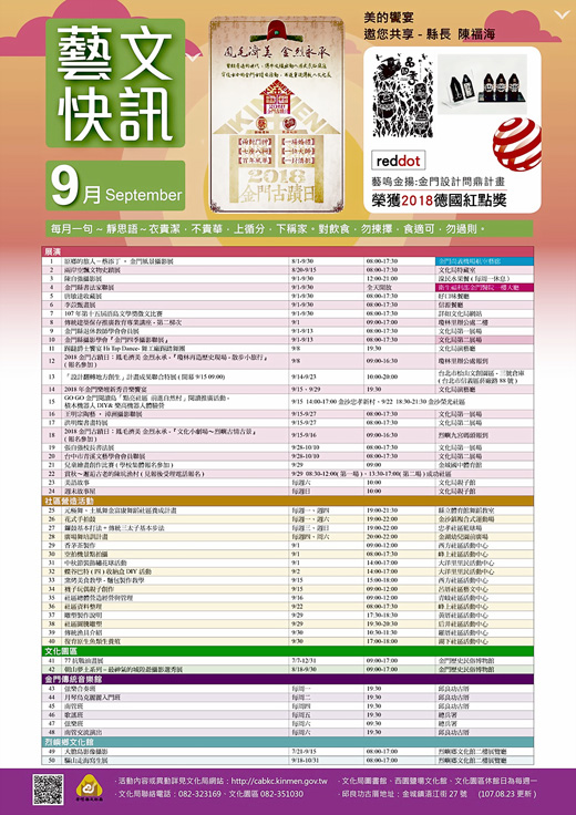 九月的藝文活動充滿了濃厚的人文風情,除了書畫、攝影、陶藝展之外,更有一年一度的古蹟日活動,還有節奏感十足的爵士踢踏舞表演、金門樂壇新秀們帶來的音樂饗宴。種種「耳得之而成聲,目遇之而為色」的生活體驗,加上對周遭的觀察、對生命的喟嘆感想以及無窮盡的想像創造力,想化諸為文字,怎能不參加浯島文學獎的徵文呢? 今年的金門古蹟日,分別在瓊林和烈嶼各有二場活動,藉由幾位老師的導覽解說,更用小劇場的方式,演出金門古式婚禮、前人的出洋落番情景和烈嶼林天助的作畫故事,讓我們對這塊土地上的歷史及文化有更深的了解。一○七年第十五屆浯島文學獎徵文比賽,今年分為短篇小說、散文、小品文組,徵文期間為9月1日至30日,歡迎鄉親踴躍投稿。 九月在文化局的展演活動有:兩岸空飄文物史蹟展,8月20日至9月15日,文化局特藏室。金門縣退休教師學會會員展,9月1日至13日,文化局第一展場;金門縣攝影學會金門四季攝影聯展,9月1日至13日,文化局第二展場。王明宗陶藝暨漳州攝影聯展,9月15日至27日,文化局第一展場;洪明燦書畫特展,9月15日至27日,文化局第二展場。張自強校長書法展,9月28日至10月10日,第一展場;台中市青溪文藝學會會員聯展,9月28日至10月10日,第二展場。踢踏爵士饗宴Hi Tap Dance—舞工廠踢踏舞團,9月8日,文化局演藝廳。二○一八金門樂壇新秀音樂饗宴,9月15日、9月29日,19:30,文化局演藝廳。 走讀金門,遙想先人胼手胝足的年代,認識腳下的這片土地。二○一八金門古蹟日—鳳毛濟美˙金烈永承「瓊林再造歷史現場—散步小旅行」,9月8日,09:00-16:30,瓊林里辦公處報到。二○一八金門古蹟日—鳳毛濟美˙金烈永承「文化小劇場—烈嶼古情古景」,09:00-16:30,烈嶼九宮碼頭報到。賞秋—邂逅古老的陳坑漁村,08:30-12:00、13:30-17:00,成功社區。 另有金門閱讀島「點亮社區˙前進自然村」閱讀推廣活動—積木機器人DIY&樂高機器人體驗營,9月15日,14:00-17:00,金沙忠孝新村、9月22日,18:30-21:30,金沙榮光社區。美語故事,每週六,文化局親子館;周末故事屋,每週日,文化局親子館。兒童繪畫創作比賽,9月29日,金城國中體育館。 分散在金門各處的常態展覽有:陳自強攝影展,9月1日至30日,■民水果餐。唐敏達收藏展,9月1日至30日,好口味餐廳。李苡甄畫展,9月1日至30日,信源餐廳。金門縣書法家聯展,9月1日至30日,金門醫院一樓大廳。原鄉的旅人—蔡添丁金門風情攝影展,8月1日至9月30日,尚義機場航空藝廊。 本月在文化園區(金門歷史民俗博物館)策畫展出的有:七七抗戰油畫展,7月7日至12月31日。朝山夢土系列—最神氣的城隍爺攝影選秀展,8月18日至9月30日。 在烈嶼鄉文化館的展覽則有:大膽島影像攝影,7月21至9月15日,二樓展覽廳;驅山走海寫生展,9月18日至10月31日,二樓展覽廳。 持續在社區進行的營造活動,本月各社區有以下的活動:窯烤美食教學麵包製作教學,9月15日,15:00-18:00,西方社區活動中心;襪子玩偶親子創作,9月15日,09:00-12:00,呂厝社區藝文中心。社區總體營造經營與管理,9月16日,09:00-12:00,青岐社區活動中心。社區資料整理,9月22日,08:00-17:30,峰上社區活動中心。雕塑製作說明,9月29日,17:30-18:30,黃厝社區活動中心;社區圖騰雕塑,9月29日,19:30-20:30,后井社區活動中心。傳統漁具介紹,9月30日,10:30-11:30,羅厝社區活動中心。復育原生魚類生養殖,9月30日,17:00-18:00,湖下社區活動中心。元極舞土風舞—金富康舞蹈社區養成計畫,每周一、四,19:00-21:30,縣立體育館舞蹈教室。花式手拍鼓,每周一、六,19:00-22:00金沙鎮複合式運動場。鑼鼓基本打法+傳統三太子基本步法,每周三、日19:00-22:00,忠孝社區籃球場。廣場舞培訓計畫,每周四、六20:00-22:00,金湖幼兒園前廣場。 每周在邱良功古厝及總兵署開班的傳統音樂館:弦樂合奏班,每周一19:30,邱良功古厝。月琴烏克麗麗入門班,每周二19:30,邱良功古厝。南管班,每週四19:30,邱良功古厝。歌謠班,每周五19:30,總兵署。弦樂班,每周六09:30,總兵署。南管交流演出,每周六19:30,邱良功古厝。 活動內容或異動,詳見文化局網站http://cabkc.kinmen.gov.tw或洽詢文化局082-323169文化園區082-351030 。