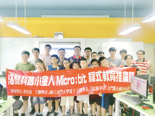 國立金門大學啟動環島科普列車,首站駛進多年國小,金門縣政府教育處長李文良讚許金大提供離島小朋友學習程式設計的機會,也鼓勵金大繼續開設此類課程,嘉惠更多學子和滿足各年齡層人士的學習需求。 為促進金門地區國民中、小學科普知識與教育推廣,由科技部主辦、國立金門大學電子系承辦、金門縣政府教育處協辦的環島科普列車,以「micro:bit程式運算思維研習營」為主題,巡迴校園提供學子研習的機會,第一站是多年國小,受到師生的歡迎。縣府教育處長李文良主持開營儀式,並語多鼓勵。 研習活動由金門大學電子工程學系李金譚老師帶領的科普志工團隊負責執行。李金譚表示,micro:bit是英國廣播公司BBC於2016年中推出專為英國學童學習編程和電子創作的微控制器,免費發送給英國中、小學學生使用,以在全世界的數位浪潮下,有效掌握對程式邏輯和語言的掌控,將對未來職涯有舉足輕重的影響。 李金譚表示,本次研習內容多元,主要教導學童利用積木式圖像介面軟體,讓學童學習程式編寫及控制板感測器使用,逐步引導學童操作,藉此訓練學童邏輯思考能力,培養創意思維。而透過認識程式語言的編輯環境,操作達成顯示環境光照度、機器手指活動、屏幕顯示心跳動畫、電子骰子、簡易水平儀、廣播與自動演奏等多項運用,參與學員們親自實機測試,完成屬於自己的作品,訓練驗證與問題解決能力。強化STEM(Science、Technology、Engineering、Mathematics,科學、科技、工程、數學)的成效。 金大指出,此系列活動,辦理25個場次,總計有20所國小與5所國中學校參與研習營,多年國小是第一站,透由活動來培養學子們創意應用,啟發孩童程式運算思維,並帶動金門地區程式設計的風潮。