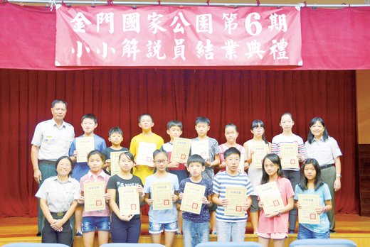 金門國家公園舉辦第6期小小解說員培訓活動昨日舉行結訓典禮,計有王正柏等22名國小學員通過實習結業,金門國家公園管理處副處長蘇承基頒發小小解說員服勤證書,勉勵小小解說員多加服務與學習,一起共創美好的人生。 金門國家公園管理處辦理第6期小小解說員培訓活動,共有地區各國小推薦的22名高年級學員參加,在經過專業訓練後,小小解說員分批至乳山遊客中心實習,正式學習乳山遊客中心的解說服務。實習期間小小解說員就開始為參訪遊客提供解說服務,小小解說員能夠學以致用,都覺得非常開心,也認為本活動讓他們增長了許多勇氣,成長很多。 暑假期間有許多親子團參訪乳山遊客中心,聆聽小小解說員運用所學,解說自己家鄉的環境,肯定國家公園辦理這樣的環境教育活動十分有意義。從這些學員身上,我們也看到保育的種子,逐漸在金門地區發芽,看出環境意識的增長,令人感到十分欣慰。 金門國家公園管理處表示,小小解說員能夠完成各項受訓階段,非常不容易,不但要有高昂的學習意願,更要有恆心與毅力去完成每個受訓階段的訓練。金管處也感謝小小解說員的家長以及學校的協助與鼓勵,讓學員能夠完成成長與蛻變。不僅自我肯定,更懂得為社會付出,相信孩子在跨躍了這一步之後,一定更為成熟、穩重,對於自己生活的環境一定更有知覺力與反省力。 昨日獲頒解說員結業證書計有古寧國小王正柏、金鼎國小王昱翔、正義國小林巧浩、柏村國小何堉銨、金湖國小李雅雯、陳虹臻、李毅安、陳俞云、何浦國小許肇庭、安瀾國小王翊蓁、林依君、中正國小許嘉容、謝書怡、李依庭、鄭喬依、呂菱勻、蔡子瑜、蔡顯擎、盧思伶、古城國小倪侑駿、述美國小李宇茜、開瑄國小蔡宜蓁等廿二名。