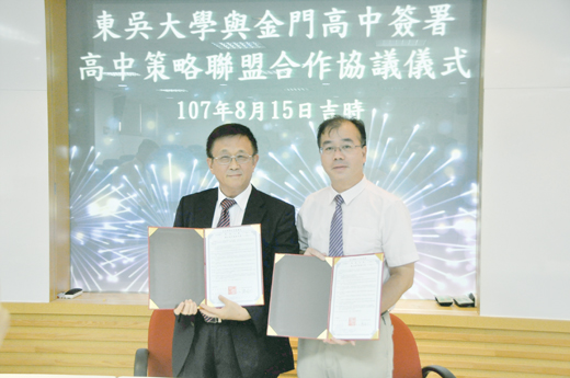 創校已118週年的東吳大學,昨日與國立金門高中簽署策略聯盟合作協議,東吳大學副校長董保城歡迎金門高中畢業生未來升學可以選擇就讀東吳大學;金門高中校長廖俊仁則以學校最缺法政和商管,能跟東吳大學簽署策略聯盟合作協議,正可補足學校的不足,而簽署只是開始,未來希望有更多合作推展。 簽署高中策略聯盟合作協議,昨日下午二時起在金門高中國際視聽會議室舉行,雙方代表並觀賞學校簡介和互換禮物。東吳大學出席代表,除了副校長董保城,還有主任秘書王淑芳、教務長詹乾隆;金門高中出席代表,包括校長廖俊仁、秘書許清土,以及各處室主管,還有金門縣東吳大學校友會會長葉肅科。 金中校長廖俊仁指出,東吳大學在「法政學群」和「財經學群」畢業生表現,均為私立大學第1,因此,東吳大學要和金門高中簽署策略聯盟合作協議,他未加考慮就答應了,就是希望補足學校的不足。 東吳大學副校長董保城強調,該校不是教會學校,也不是家族私人學校,更不是財團學校,學校的發展靠校友,教育理念也是把孩子教好。他指出,東吳大學於1900年創校於中國蘇州,為中國第一所西制大學;1954在臺灣復校,為臺灣第一所私立大學。建校百年來,秉持中、英文校訓「養天地正氣 法古今完人」、「Unto A Full-grown Man」之教育理念,辦學嚴謹,學風樸實,深具傳統,建立老字號品牌形象。 而學校是以教學為主、研究兼重之綜合大學,擁有外雙溪、城中兩校區,設有人文社會、外國語文、理、法、商及巨量資料管理等六個學院,共26個系所、學位學程。兩校區均鄰近臺北市政治、經濟、文化中心,周邊教育、研究、學習及社會資源豐富多元,交通便捷。歡迎金門高中畢業生未來升學可以選擇就讀東吳大學。 東吳大學與國立金門高中簽署策略聯盟合作協議,係為促進甲方、乙方二校教育經驗交流,建立教學、研究與行政資源之整合運用及互惠共享機制,提升教育效益與整體競爭力,經雙方協議後,特訂定兩校策略聯盟合作協議書,共同遵照履行。 協議內容為: 第一條:甲、乙雙方除密切保持行政聯繫與交流外,並得經協商後相互支援使用教學設備及其他相關教育設施與場地等軟硬體資源。前項相關教育設施之內容及其使用方式由雙方協商訂定之。 第二條:甲、乙雙方得互邀參與學術研討會或研習進修活動,並配合及協助相關研究計畫之進行。 第三條:雙方教職員工生得經協商後同意使用對方圖書館相關設備,並應依相關閱覽規則借閱圖書,以達資源共享及互惠互利之目標。 第四條:甲方得應乙方之邀請,以專題演講或座談等方式,提供教師專業成長與學生升學諮商、生涯規劃及性向或心理分析之輔導;並優先安排乙方師生至甲方參訪校園或進行系所介紹。 第五條:甲方提供乙方其所舉辦之各項職能研習、競賽及營隊等活動資訊,並優先邀請乙方教職員生參與。 第六條:乙方學生參加甲方開設之大學先修課程,成績及格者,得依學系規定於錄取後申請學分抵免。 第七條:乙方教職員工於優惠期間報名參加甲方推廣部開設之課程時得享學費九折優惠。 第八條:甲方得應乙方之邀請推薦教師,協助輔導乙方學生參加創意科學展覽及專題實作等競賽活動,以增進彼此交流合作關係。 第九條:本協議書自簽約日起三年內有效,期滿經雙方同意,得延長合作年限。協議期間內,若其中一方有意終止本協議書時,應於三個月前以書面通知對方。本協議書如有未盡事宜,得經雙方同意修訂,修正時亦同。