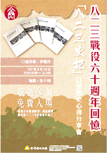 八二三戰役六十周年回憶,金門縣文化局主辦「八二三史記」口述歷史心得分享會,十八日晚上七時至九時在金城朱子祠登場,由作者李福井主講,文化局並提供剛出爐的套書六套,作為當場問答贈送聽眾的禮物,歡迎民眾一起來回顧與分享。 「八二三史記」一套四本,分別是一、《太武山驚天一擊》;二、《軍民搏命護家邦》;三、《漫天烽火遷徙潮》;四、《驀然回首看和戰》。作者花了十二年的時間,訪談橫跨兩岸三地,彰顯金門在這場戰役的主體性,為金門人發聲。 《太武山驚天一擊》與《軍民搏命護家邦》兩本書,剛獲得今年國史館文獻獎佳作獎。今年繼續完成兩冊,及時出齊作為八二三砲戰對金門鄉親的獻禮。 文化局指出,「八二三史記」作者李福井平日除了深入金門鄉下,訪談耆老民防隊,聽他們述說當年冒著砲火搶灘的故事之外,也訪問在戰爭中的受害者,讓他們有機會述說內心的傷痛。 此外,針對金門中學當年寄讀台灣的學生,經作者多年的訪談與爬梳史料,也讓這些流亡學生歷史歸位。而當年台灣充員兵到金門服役,保家衛國的犧牲奉獻,家屬喪失親人的苦痛,幾十年來無人聞問與理解,透過作者的筆觸,也在這套載滿血淚的史書中充分的表達出來。 十餘年來,作者也深入中國大陸大嶝、小嶝、圍頭與廈門的何厝、曾厝垵,訪談當年支前的民兵,發現大陸傷亡慘重,戰爭其實沒有贏家。六十年後回顧這場戰役,政大台研所教授陳芳明評論這套書:「這不僅僅是一部悼亡書,而是把人性拉高,讓讀者看見高尚的歷史同情。」