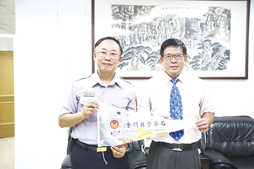 國立金門大學新任校長陳建民於9日下午前抵金門縣警察局拜會,受到局長劉耀欽與副局長江守寰歡迎接待,彼此也針對智慧警政等相關作法交換意見,相談甚歡。 金門大學陳建民校長是縣警察局傑出警友,此次是抱著「回娘家」的心情回到警察局,同時陳建民校長與劉耀欽局長是警官學校前、後期學長、學弟,更與副局長江守寰有同窗情誼,雙方相見歡。 陳建民校長在金門高中畢業後攻讀中央警察大學外國事務學系及警政研究所,並取得中國文化大學中山學術研究所博士學位,他也曾在縣警局服務,轉換職場後在各方面都有傑出的表現,此次榮任國立金門大學校長,劉耀欽局長及同仁除了向他道賀,也感到與有榮焉。 陳建民校長也鼓勵警察局同仁有機會能夠到金門大學進修,提升學術涵養及專業知能;博士局長劉耀欽也期勉同仁向傑出的前輩看齊,努力自我實現。