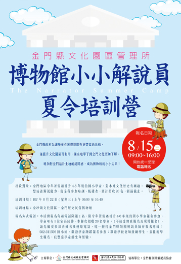 文化園區管理所訂於8月22日辦理「107博物館小小解說員夏令培訓營」活動,將邀請黃振良、吳啟騰、陳成基等在地知名文史工作者擔任講師,活動限額20名,限金門地區今年暑假後升讀國小四至六年級學童報名參加,8月15日上午9時起受理報名,每通電話限報1名,一律受理電話報名,報名專線082-311596,陳小姐。 為讓學童在暑假期間有更豐富的活動,增加在地學子對金門文化認知及土地認同感,文化園區管理所特別辦理「107博物館小小解說員夏令培訓營」活動,時間 107年8月22日上午09:30至下午16:40時,假文化園區歷史民俗博物館。內容規劃有,博物館實地導覽、解說技巧說明、實際模擬導覽及分組討論等。活動訂於明(15)日上午9點開始統一受理電話報名,每通電話限報1名,限金門地區今年暑假過後升4-6年級的國小學童報名參加,學童可有1位家長陪同,預計招收員額20名,(不接受傳真報名及現場報名),歡迎學校老師鼓勵學生報名參加,報名專線082-311596陳小姐。 文化園區管理所表示,學童從小接觸博物館及參與活動,不僅能增加對金門在地文化的認知,也能增進溝通與表達能力。完成培訓、並通過全部課程者,可領取培訓結業證書,另評選最優前3名者可成為金門縣文化園區管理所小小金牌解說員,頒發獎狀及獎品,未來更有機會參與博物館活動及解說服務。 「107博物館小小解說員夏令培訓營」活動將邀請黃振良、吳啟騰、陳成基等在地知名文史工作者擔任講師,敬請學童於報名後,活動當日(8月22日)上午9時前開始於文化園區歷史民俗博物館大廳辦理報到,09:30準時開始活動,逾時不候。