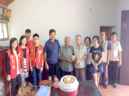 金門縣榮服處處長呂媽定近日與榮服處同仁前往拜會住在金寧鄉、將近百歲的吳煥彩爺爺,祝賀他老人家福如東海,壽比南山。 金寧鄉安美村823金馬自衛隊榮民吳煥彩爺爺將屆滿百歲,金門縣榮服處處長呂媽定偕同責任區服務人員及志工們,代表輔導會邱主任委員為莊老先生祝賀期頤壽誕,並致上金壽桃一座,祝福他身體健康,福壽雙全。 吳爺爺世居金門,年少即隨父務農,事親至孝。爺爺雖然已屆百歲高齡,但身體仍硬朗,思緒清晰;凡憶起823砲戰及古寧頭戰役等往事,均能對當時一一景況描述如昨般的傳神。吳爺爺育有子女各3,如今各自事業有成,家庭和樂美滿,子女兒孫並經常返家陪伴吳爺爺,在鄉里傳為美談。 吳爺爺雖已高齡百歲,但身體硬朗,據爺爺表示餐餐七分飽,並保持定時定量的運動習慣,所以即是百歲高齡,依舊行動自如。呂處長特別代表輔導會主任委員祝賀爺爺福如東海,壽比南山,快樂過著每一天,讓吳爺爺非常開心。
