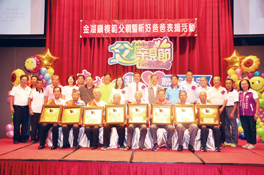 父親節將至,金湖鎮公所於金湖飯店表揚「鎮表揚」模範父親和新好爸爸,由縣府秘書長林德恭、金湖鎮長蔡西湖、金湖鎮代會主席蔡乃靖等人共同頒獎表揚。 由於縣政府已表揚「縣表揚」模範父親和新好爸爸,因此金湖鎮公所僅表揚「鎮表揚」模範父親和新好爸爸。 縣府秘書長林德恭致詞表示,模範父親暨新好爸爸得獎人是經過各村里長推薦、鄉鎮公所評選產生,他們有感人的溫馨家庭故事,並在鄉鎮長建議之下,爸爸與媽媽一樣偉大,縣府在父親節前夕舉辦與母親節一樣隆重的表揚及聯誼會活動。同時,他說,父親像一座山一樣,是全家庭的依靠和支柱,模範父親和新好爸爸都是表現傑出、熱心公益及對家庭、社會有貢獻,才能接受表揚,也是一種榮譽,更承擔起一個家庭的重責大任。 金湖鎮長蔡西湖祝福所有爸爸們,父親節快樂,他感謝代表會預算支持、感謝里長推薦各里模範父親和新好爸爸,也鼓勵所有父親們,年輕時為了家庭犧牲奉獻,老了要放輕鬆、「享受人生」,要照顧自己的身體。 金湖鎮代會主席蔡乃靖表示,沒有養兒育女,無法體會當年父母對自己的關愛,當年我們把管教當成是無奈、煩躁,如今終於能夠體會;蔡乃靖強調,社會的祥和,要從家庭教育做起,因此各位父母親的責任也很大。 金湖鎮公所107年表揚模範父親和新好爸爸,縣表揚和鎮表揚完整名單如下: 縣表揚模範父親:蔡明源(瓊林里)、張海星(山外里)、張清泉(新湖里)、李錫坤(新市里)、陳向文(正義里)、蔡慶昌(溪湖里)、謝朝發(料羅里)、陳若愚(蓮庵里)。 鎮表揚模範父親:蔡清其(瓊林里)、李西文(山外里)、鄭明昆(新湖里)、吳永樹(新市里)、陳詩平(正義里)、李增華(溪湖里)、呂坤山(料羅里)、鄭朝補(蓮庵里)。 縣表揚新好爸爸:許丕國(瓊林里)、陳佳慶(山外里)、李文雄(新湖里)、楊添壽(新市里)、陳舜照(正義里)、劉景盈(溪湖里)、吳松山(料羅里)、呂章明(蓮庵里)。 鎮表揚新好爸爸:黃榮鋒(瓊林里)、陳恩助(山外里)、陳朝璜(山外里)、呂國全(新湖里)、李國偉(新市里)、陳志龍(正義里)、李智祥(溪湖里)、呂清豐(料羅里)、李國聖(蓮庵里)。 根據表揚規則,模範父親條件為設籍本縣年滿55歲以上之父親,10年內未獲得表揚者;新好爸爸條件為設籍本縣40歲以上,未滿55歲之父親,10年內未獲得表揚者。