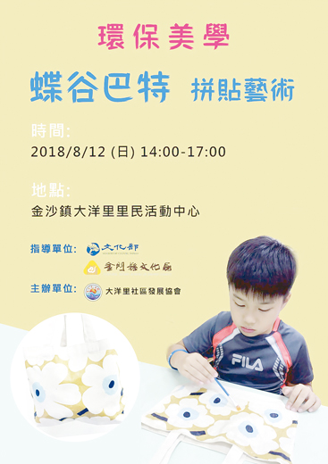 文化局為推動社區總體營造、鼓勵在地居民參與公共事務,與大洋社區發展協會將於8月18日(星期日)下午2時至5時,在金沙鎮大洋里里民活動中心1樓舉辦「2018年金門社區營造點-環保美學‧蝶谷巴特拼貼藝術計畫—『帆布袋拼貼』研習活動」,自即日起至8月10日(星期五)開放線上報名,歡迎民眾踴躍報名參加,名額有限,額滿截止。報名網址https://goo.gl/iNEq15(報名時請填寫正確報名資訊,以利主辦單位審核及通知),若有其他相關問題可電洽082-337829。 活動時間如有更動,主辦單位將以網路公告、E-mail或電話通知。當天參加活動以開車、騎車或其他等交通工具者,應遵循活動人員指示停車,避免影響交通。另外,主辦單位遇人力不可抗拒之因素,例如:颱風、暴雨等,保有隨時修改、暫停或終止該活動之權利。