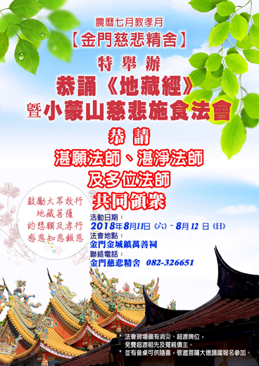 農曆七月在佛門又稱為僧伽月、功德月、報恩月、孝道月、福田月等。根據漢地傳統,在農曆七月中旬左右,中國人會在佛教寺院為自己已去世及仍在陽世的親友,分別設立超薦及消災祈福兩種不同的牌位,除了誦經、蒙山施食之外,並有為眾生作超薦及消災祈福。 生命電視台金門慈悲精舍為鼓勵地區大眾效行地藏菩薩的悲願及孝行感恩知恩報恩的心,特由生命電視台湛願法師、湛淨法師及多位法師共同領眾於(農曆七月教孝月)8月11日上午9時30分辦理金門境內灑淨,下午2時假金門慈悲精舍(金城鎮珠浦南路74巷25號)辦理地藏法會,8月12日下午2時假金城鎮萬善祠辦理小蒙山施食,法會現場備有消災、超渡牌位,免費超渡祖先及冤親債主,電話金門慈悲精舍082-326651。 生命電視台金門慈悲精舍表示,超薦法會以佛法的角度來說是冥陽兩利,除了要為已故的親友作超薦、為陽世的親友作祈福之外,更重要的意義,在於希望藉此開啟心中的慈悲心,進而學習感受菩薩為解救眾生痛苦、捨我其誰,而隻身進入地獄,毫無畏懼的大勇猛精進力。