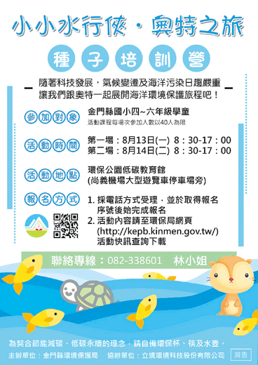 為強化金門學童對於氣候變遷衝擊基本認知,環保局規劃在本(8)月13日及14日以「海洋環境保護」為主題(海報見圖),於環保公園低碳教育館辦理2場次的「小小水行俠‧奧特之旅」種子培訓營。 環保局歡迎今年9月份起就讀國小四、五、六年級對於環境保護、節能減碳、低碳生活有興趣的學童報名參加,小朋友可請家長於9日前以電話報名,每人限報1場次,每場次招收40人,額滿候補,電話報名正取者將由該局人員告知學員報名序號,始為完成報名。報名專線:082-338601林小姐,(於上班時間上午8時至12時,下午1時30分至5時30分撥打)。而課程內容可至該局網站(http://kepb.kinmen.gov.tw/)下載。 環保局指出,現代科技發展快速,帶來便利生活品質,但也讓人類面臨一重大危機–氣候變遷全球暖化。隨著全球暖化日趨嚴重,氣候變遷透過許多方式影響到海洋生態系,如颱風頻繁、暴雨及暴潮等,該局規畫以「海洋環境保護」為主題,於環保公園低碳教育館辦理「小小水行俠‧奧特之旅」種子培訓營,希望透過豐富的學習課程,讓這些小小環保尖兵發揮各自長才,在學習中互相成長,並加深對生活環境、土地情感之關懷,以達到深耕金門樂活低碳島之目標。
