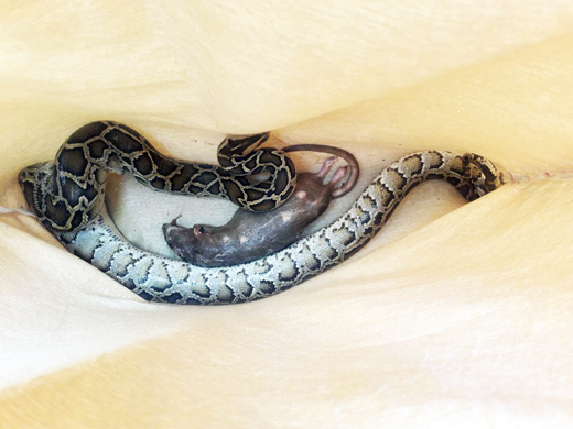 一條緬甸蟒日昨一早陷入農田的網具內,嚇到清晨農耕的農民,經金門縣政府轉請金門縣野生動物救援暨保育協會獸醫前往處理後,這條蟒蛇吐出一隻老鼠,獸醫表示,蟒蛇應該是在田間追逐老鼠捕食後受困於網內,類似個案建議民眾通報相關單位處理,避免受傷。 金門縣政府建設處表示,這條蟒蛇為雌性,體長174公分2.55公斤,協會人員黃富榆及獸醫徐曉萍抵達現場後,通報農民已自行將網具拆解,蟒蛇在帶回獸醫院檢傷過程中,吐出一隻700公克重的老鼠,依過往相關的研究顯示,金門地區緬甸蟒以小黃腹鼠為主食,但看到牠吐出這麼大的老鼠也讓現場人員吃了一驚。 縣府建設處表示,峰上地區農友為防止野生孔雀造成農損,在農地設置魚網,雖可能降低農損,但常會誤捉其他動物,若有誤捕蛇類或猛禽,請盡快通知相關單位處理,避免造成民眾或動物受傷;蛇類有很重要的鼠類族群控制效果,在維持生態系統的穩定上具有相當的重要性。