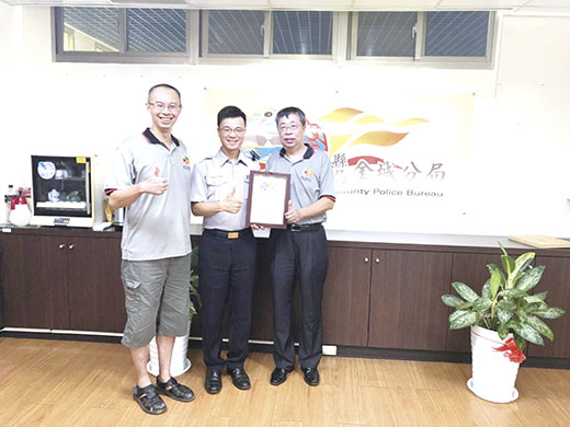 員警夜間值勤有一定的危險性存在,加強自身可被辨識性方為安全之道,為了確保金門縣警察局金城分局的員警在夜間執勤時可以安全工作,金門縣湖峰公共事務協進會日前捐贈一批「警用爆閃LED肩燈」,讓員警執勤時的工作環境更加安全。 金門縣湖峰公共事務協進會於日前,購置了一批「警用爆閃LED肩燈」,共計有四十組,並由湖峰公共事務協進會會長楊家聲以及總幹事賴盈璋等人代表前往金城分局捐贈。楊家聲與賴盈璋兩人表示,為使員警夜間執勤安全多一層保障,因此特別購買爆閃LED肩燈,提供給員警在夜間執勤時來使用,希望讓員警執勤時更為安心,也期望用路人能夠「見燈減速、安全隨行」,增加用路人視覺效果,使員警「安心、放心及用心」全力投入各項交通疏導及事故處理勤務。 金城分局指出,金城地區各個重要道路,由於交通流量龐大,為了要維護行車安全,因此警方會不定時的實施交通稽查以及路檢勤務。一般而言,在白天時沒有照明上的問題,但於夜間執勤的時候,有部分路段雖有路燈以及巡邏車警示燈的輔助,但現場環境光源依舊仍稍有不足的狀況,為加強辨識度及能見度,警方特別感謝金門縣湖峰公共事務協進會不吝慷慨解囊捐贈警用爆閃LED肩燈四十組,提供給分局的員警於服勤使用。