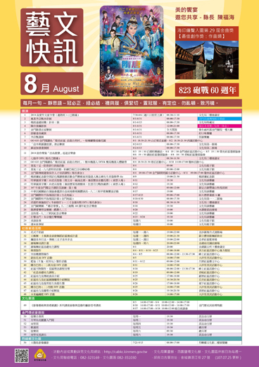 文化局8月藝文活動正式出爐!除延續部分展出外,還推出許多新奇有趣的手作活動與精彩可期的藝術表演,當然最讓人期待的八二三60週年紀念活動也將正式登場,接連數週的高規格表演更是不容錯過。除此之外,還有文化局持續推動的社區營造活動,以及文化園區、金門傳統音樂館、烈嶼鄉文化館等,都有許多層次豐富、類型多元的精彩活動,歡迎民眾踴躍參與。 常態性的展覽包括有從8/1展至8/31的風柔李苡甄水彩展(金門尚義機場航空藝廊)、陳自強攝影展(湶民水果餐)、金門縣書法家聯展(衛生福利部金門醫院一樓大廳)、唐敏達收藏展(好口味餐廳)、李苡甄畫展(信源餐廳),以及從8/1至8/15的楊銘達縫紉機﹝針車﹞展(文化局特藏室)。還有即將在8/2開展至8/15的「追本朔源識從頭」書法聯展 (文化局第一展場)與蘇益加書畫個展(文化局第二展場)等。 推廣閱讀的部分,除了固定於每週六、日舉辦的美語故事(文化局親子館)、週末故事屋(文化局親子館)外,還特別舉辦GOGO金門閱讀島「點亮社區—前進自然村」系列活動,將走入社區帶領民眾一同手作及體驗,8月份共有2種活動合計4場次,活動1是「玻璃罐微境綠花園」8/1(山后梁氏家廟)、8/2(西園活動中心);活動2則是「積木機器人DIY&樂高機器人體驗營」8/4(塔后活動中心)、8/18(瓊林活動中心)。 當然還有大家期待許久的「爸氣十足」相關活動,有8/4借書排行表揚活動與八八節特別活動—彩繪巴啦巴豆咕嚕咕嚕(文化局親子館)。 此外,喜歡手作的民眾更不能錯過迎接七夕的特別活動8/4「七娘亭DIY」(文化局三樓會議室)、8/9「金門藝術家貝殼達人陳志緯貝殼教學DIY」(楊清廉紀念館),還有8/18「消逝的東施娘仔(冬絲娘仔)-三寸金蓮布鞋DIY」(文化局三樓會議室)啦! 另外,文化局一直很重視的傳統建築及古蹟維護方面,在8月份將舉辦2場次的「金門縣傳統建築保存人才培訓課程」分別是8/4(開瑄國小活動中心)及8/11(瓊林社區活動中心),還有「107年度金門縣定古蹟防災演練—第1場」8/17(縣定古蹟豐蓮山牧馬侯祠)。 而音樂展演則有2018唐伶樂集「浯島歌聲」巡迴音樂會,分別在8/3(后湖昭應廟前)、8/4(金門城社區活動中心)、8/5(榮光社區發展協會)、8/6(湖前社區發展協會)、8/8(青岐社區發展協會)進行演出。 不過8月份最重要的活動,也是最引人矚目的,當然是八二三60週年相關系列活動,一開始就由「明華園黃字團:向老兵致敬」於8/11及8/12在文化局演藝廳的熱烈演出拉開序幕。接著登場的,包括有8/17「八二三和平歌舞饗宴活動」(文化局演藝廳)、8/17-8/30「金門國際和平海報設計展」(8/17-8/23台北地區—師大德群畫廊A廳;8/18-8/30金門地區—文化局第一、二展場)、8/18「金門國樂團—『鄉音寄懷』八二三砲戰-60週年紀念音樂會」(文化局演藝廳)、8/20「龍潭愛樂管弦樂團—禮讚八二三」(水調歌頭前廣場),以及8/22「金防部-八二三軍民紀念音樂會」(文化局演藝廳),最後再由壓軸的8/23、8/24「打響金門:朱宗慶打擊樂團」(文化局演藝廳)為八二三60週年紀念活動劃下完美的句點。 而在文化局持續耕耘推動的社區營造活動方面,8月份仍然在各鄉鎮社區進行,包括金沙鎮複合式運動場(每週一、週六:花式手拍鼓)、縣立體育館舞蹈教室 (每週一、週四:元極舞、土風舞金富康舞蹈社區養成計畫)、忠孝社區籃球場(每週三、週日:鑼鼓基本打法+傳統三太子基本步法)、金湖幼兒園前廣場(每週四、周六:廣場舞培訓計畫)、金湖鎮公所3樓會議室(8/1廣場舞社區基礎培力課程)、西方社區活動中心後方頹屋(8/4、8/11、8/18、8/25:柴窯製作)、峰上社區活動中心(8/4、8/5空拍機實際操作;8/18社區刊物製作、低碳理念課程宣導)、大洋里里民活動中心(8/5鈕扣花束DIY活動;8/11蝶谷巴特(一)帆布袋DIY活動;8/25蝶谷巴特(二)相框DIY活動;8/26水果編織籃DIY活動)、呂厝社區藝文中心(8/11、8/12藍染(T恤、托特包)製作活動)、青岐社區活動中心(8/19「社造基礎培力課程」)、羅厝社區活動中心(8/25社區培力及傳統漁具介紹)、后井社區活動中心(8/25社區培力及社區圖騰雕塑介紹解說)、湖下社區活動中心(8/26社區培力及復育原生魚類生態)、黃厝社區活動中心(8/26社區培力及雕塑介紹解說)等。 文化園區則是在金門歷史民俗博物館於8/3、8/4、8/10、8/11、8/17、8/18舉行《影像藝術與資產維護》系列講座掠像與造像的攝影思考講座;在金門傳統音樂館則是維持每周定點練習,分別在邱良功古厝(每周一弦樂合奏班;每周二月琴烏克麗麗入門班;每周四南管班;每周六南管交流演出)與總兵署(每周五歌謠班、每周六弦樂班)等都有演奏活動;烈嶼鄉文化館則是持續在二樓展覽廳展出大膽島影像攝影。 文化局所推出的8月份藝文活動涵括人文藝術的深度與廣度,活動內容更是老少咸宜,歡迎鄉親、民眾踴躍參加,詳情也可上文化局網站查詢,若有異動以文化局網站公告為準。