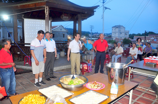 圖文/陳冠霖 金湖鎮正義社區發展協會29日晚間在社區三角公園舉辦敬老美食聯誼餐會,由社區志工媽媽料理許多美食給社區鄉親們品嚐,並現場播放電影讓大家觀賞,搭上晚上戶外涼風徐徐,十分愜意。縣長陳福海、秘書長林德恭、金湖鎮長蔡西湖等人也到場致意,並和社區志工媽媽們一起品嚐美食。