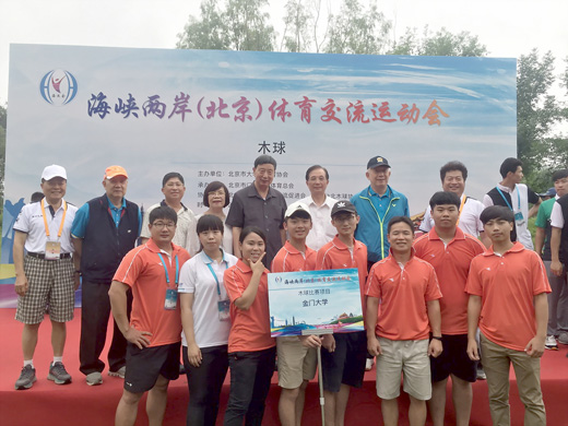 金門大學木球隊參加2018海峽兩岸(北京)體育交流運動會木球賽榮獲1金1銀及團體第五名,在兩岸發光,此次金大吳曉蕙榮獲女子球道賽冠軍、何聰賢&曾柏晏榮獲男子桿數雙打亞軍、男子團體也獲得桿數賽第五名,再次讓兩岸看到金門。 2018海峽兩岸(北京)體育交流運動會簡稱『海運會』,是迄今為止規模最大的兩岸綜合性民間體育交流賽事。從7月18日至24日,兩岸近4000名運動員分別在北京9所大學和5個區縣進行13個項目的比賽、展演和交流。臺灣有39所大學的965名大學生運動員和近800名體育運動愛好者專程到北京來參加比賽及交流活動,7月19日晚由來自兩岸76所大學的運動員代表近千人彙聚大陸清華大學清華園參加開幕。 「海運會」設置競技類項目有:籃球、足球、排球、羽毛球、乒乓球、橄欖球;群體類項目有:木球、龍舟、啦啦操、慢投壘球;表演類項目有:門球、柔力球和飛盤。 國立金門大學管理學院受邀參加此次賽會,同時聘請董燊院長擔任籌備委員,協助規劃賽會,董燊院長帶領木球、羽球、桌球三項團隊由金門經廈門搭火車到北京參賽,木球比賽在北京門頭溝區忠良書院舉行,參加木球開幕式的嘉賓有教育部前部長吳清基先生,木球運動發明人,國際木球總會會長翁明輝先生及夫人翁歐素清女士等十一位貴賓,北京市大學生體育協會競賽部部長郝光安教授、北京木球協會副主席徐英克先生及多所大陸高校的體育部主任也出席。 金大木球隊是由董燊院長擔任領隊兼教練,帶領經理周復國,男選手:曾柏晏、程建閎、何聰賢、葉衍佑、董晏廷、林家宏。女選手;吳曉蕙、呂曉媛、邱婉婷等人參加比賽,歷經三日角逐,金門大學吳曉蕙榮獲女子球道賽冠軍、何聰賢&曾柏晏榮獲男子桿數雙打亞軍、男子團體也獲得桿數賽第五名(曾柏晏、程建閎、何聰賢、葉衍佑、董晏廷、林家宏),再度打響金門知名度,讓兩岸看到金門,圓滿完成兩岸交流。