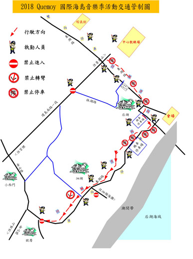 「2018 Quemoy國際海島音樂季」自明天(7月25日)起至8月4日在金寧鄉后湖海濱公園舉辦,金門縣警察局金城分局針對活動期間會場周邊實施交通疏導管制,以維護參加活動人員、工作人員行車安全順暢,並呼籲前往參加活動之人員及行經管制路段之人車,配合交通警察及協勤民力現場指揮管制,讓本活動順利進行。 金城分局指出,針對明(7月25)日活動開幕當天,主辦單位金寧鄉公所預估參加人數將逾萬人,金城分局於開幕當日上午10時起至夜間12時止實施交通管制措施: 一、參加活動人員之汽機車可停放於金防部中心教練場,並搭乘金門車船處接駁專車進入活動會場。 二、環島南路一段駛入東湖路至活動會場路段,車輛採單向通車,並禁止自泗湖、歐厝村莊駛入會場。 三、參加活動民眾機車駛入后湖海濱公園,依主辦單位規劃位置停車。 四、環島南路東湖路口至活動會場停車場路段禁止停車。 五、后湖海濱公園停車場出口起往歐厝方向之東湖路路段開放單邊靠右側停車。 六、后湖海濱公園大型車停車場實施淨空,供接駁專車迴轉及停放。 七、環島南路林湖路口往后湖村車輛,為避免參加活動民眾車輛停放影響村民通行權益,活動期間該路口車輛進出實施管制。 八、工作人員車輛憑通行證駛入活動會場,現場由活動主辦單位派員負責管制及辨識。 九、轉彎處、路口禁止停放車輛及路邊嚴禁雙邊停放車輛。 十、救護車、消防車、執行公務車輛,開放通行。