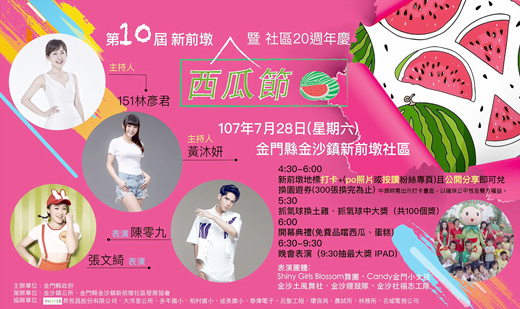 「第10屆新前墩西瓜節暨社區20週年慶」即將於7月28日登場,新前墩地標打卡兌獎下午4時30分起,系列活動於下午5時登場,包括,抓氣球換土雞、抓氣球兌獎等並於下午6時起進行開幕典禮,有免費西瓜、蛋糕品嚐,及消費集點摸彩活動,也安排晚會表演,並將於晚間9時30分抽出最大獎,新前墩社區歡迎鄉親踴躍參與。 「第10屆新前墩西瓜節暨社區20週年慶」即將於28日登場,社區志工緊鑼密鼓準備中,近期除了「夏日豐收」彩繪牆增加不少裝置,民眾不妨前往社區尋寶。而活動推出地標打卡+PO文分享兌獎活動,自下午4時30分起,兌完為止。系列活動自下午5時起,今年邀請林彥君、黃沐妍主持,5時30分登場抓氣球換土雞、抓氣球中大獎(共100個獎)。下午6時進行開幕典禮,將邀與會貴賓致贈西瓜節公仔、揭曉抽獎禮品,也將為社區20周年慶切蛋糕,現場並提供免費西瓜、蛋糕供民眾品嚐。 今年活動同樣邀請商家到場設置攤位,民眾凡集滿3個商家店長即可參加抽獎。晚會中除了邀請張文綺、陳零九等藝人到場表演外,CANDY 金門小女、金沙腰鼓隊、金沙土風舞社、Shiny Girl Blossom舞團以及多個地區社團將到場演出。最大獎I PAD將壓軸於晚間9時30分抽出。新前墩社區歡迎鄉親踴躍參與,當晚提供公車接駁服務(下午3:30自金城公車站;3:50自山外公車站發車前往,回程為晚間10:00由新前墩發車),也敬請鄉親多加利用。