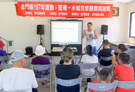 炎炎夏日為海邊戲水高峰期,金門體育會委託金門縣潛水協會辦理宣導活動,將重要的水域活動安全知識送到社區。日昨假大洋里辦公處舉辦,由中華民國水中運動協會CPR教練、中華民國海上救生協會救生教練陳念誠主講,分別透過影片、實例,告訴與會民眾夏日戲水安全的重要,並傳授救溺五步、防溺十招以及CPR心肺復甦術,期能讓大人、小孩皆建立正確水域安全知識及應變之道,讓夏日水域活動安全多一分保障。 金門縣107年運動i臺灣-水域自救觀摩與宣導講習,於7月16日起至7月20日止共計五梯次。由金門縣體育會委託金門縣潛水協會辦理,7月16日至19日在金寧鄉公所3樓會議室已辦理四梯次。20日這次活動為第五梯次,也是首次下鄉至金沙鎮大洋里,結合田浦、大地、大洋社區發展協會,假大洋里辦公處辦理,主要內容為親子水域活動安全宣導,計有20位大洋里民報名參加,有親子攜手亦有祖孫同行。 活動邀請中華民國水中運動協會CPR教練、中華民國海上救生協會救生教練陳念誠擔任講師,他透過影片教學以及近期國內外案例分析,將水域活動重要的自救互救要領、救溺五步、防溺十招以及水域遊憩警示旗幟辨識,傳授CPR心肺復甦術,也引領與會民眾進行練習。 主辦單位也表示,每年四至九月為民眾從事水上休閒活動高峰期,鑑於近年來水域意外事件頻傳,特別辦理宣導講習,希望能夠重要的防溺、救溺、水中安全以及自救等觀念帶給民眾,讓大家不分老幼人人都能建立正確的水域活動安全觀念,辨識危險水域,避免不當戲水行為等,提昇正確應變,以預防水域遊憩意外事件發生,讓大家共同提高警覺,維護夏季水域活動安全,進而達到運動人口倍增等。 金門縣107年運動i臺灣-水域自救觀摩與宣導講習,由教育部體育署指導、金門縣政府主辦、金門體育會、金門縣潛水協會承辦,依據體育運動政策白皮書暨教育部運動發展基金相關作業要點辦理,今年度預定辦理十個梯次,每梯次人數限15-20人,時間6小時,上午9時至12時,下午1時至4時。課程內容有水域活動安全宣教、自救互救觀摩及CPR觀摩實作,為鼓勵地區民眾參加,全程參與講習結束並贈送每人精美禮品一份。 金門縣潛水協會表示,今年度已辦理五個梯次,尚有五梯次即將舉辦,地區學校、機關、社團、社區發展協會團體等若有需求可以洽詢及報名參加,報名專線0933629490,陳教練。