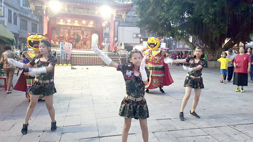 每年農曆六月初二是金城鎮西門里外武廟韓王爺聖誕千秋,廟方13日起一連二天熱鬧舉行醮慶祈福,14日下午並繞境巡安,金門縣浯島千順神將文化推廣協會「千順神將Q版電音風獅爺舞蹈團」13日晚在外武廟前演出,激情四射的電音形式傾情演繹金門民俗文化相當吸睛,也為廟慶活動帶來熱鬧氣氛。 西門里外武廟舉行「韓府王爺聖誕千秋清醮祈福大典」,「千順神將Q版電音風獅爺舞蹈團」13日晚應邀在外武廟前廟埕演出,這群就讀金城國中和中正國小的許怡君、戴郁祈、楊燾榕、徐安柔、傅臻慈等學生,以激情四射的電音形式現場傾情地演繹出金門的傳統民俗文化!兩尊威風十足的Q版風獅爺手持機槍,與三位身穿性感迷彩服的素人翩翩起舞,將金門的戰地文化和閩南民俗表演到極致,精彩的演出,吸引來往民眾駐足欣賞。 慶賀西門境主韓王爺聖誕千秋,外武廟管理委員會14日下午也在信徒的簇擁下也請出廟內王爺神尊出社繞境巡安,庇佑地方風調雨順,居民平安順利,為整個廟慶活動帶來最高潮。 地方耆老指出,外武廟又名馬舍宮,位於金城鎮西門里光前路,自明、清以來奉祀主神為關聖帝君、韓王爺,其中,韓王爺為西門境守護神,消災化厄、驅邪治病、保境安民,善於捉拿竊盜,寺廟香火鼎盛。韓府千歲名諱良,又稱韓府王爺,是西周時代經玉旨敕封下凡救世,身騎駿馬,手持「弓箭」之青年武將,因神靈顯赫,濟世救人,扶危救劫,到處遊巡,鄉人感念韓府千歲德澤,仁風遠播,圖報宏恩,後人立廟奉祀;外武廟韓王爺為西門境守護神,保境安民。 「金門縣金城鎮南門境天后宮千里眼順風耳將軍會」成立於2005年,並於2011年正式立案登記為「金門縣浯島千順神將文化推廣協會」,現任理事長許亞仁為營造全民參與、塑造廟會氣氛,以及弘揚推動民俗才藝,提升地方文化水準,且培養兒童正確休閒活動,即先從會員的孩童中挑選活潑、上進、有活力者,以結合金門傳統民俗與神明祭祀及加入流行電音舞曲,並經嚴格訓練後,組成了「千順神將Q版電音風獅爺舞蹈團」,每年對於學業成績優秀或家境不佳的兒童,會頒發獎學金或助學金鼓勵他們上進求學,希望他們學習不落人後,將來也能出人頭地。