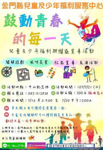 兒少宣導活動即將登場,歡迎全家相揪快樂一夏!金門縣兒童及少年福利服務中心,訂於7月21日假中山林,辦理「鼓動青春的每一天」兒童及少年福利與權益宣導活動,現場設有風味美食、遊戲、宣導攤位以及各社團表演等,規劃以宣導及闖關方式帶民眾認識兒童及少年的福利與權益,限額300名,即日起至7月20日止受理報名,歡迎民眾闔家前往參與,報名請洽082-312838。 「鼓動青春的每一天」兒童及少年福利與權益宣導活動,由金門縣政府、金門縣兒童及少年福利服務中心主辦,金門縣青少年暨兒童關懷協會承辦,公益彩券盈餘補助。訂於7月21日假中山林舉辦。凡完成事先報名的民眾,在活動當日報到時可以獲得餐券乙張(可兌換風味美食與飲料各一份),每個家庭完成闖關後皆可獲得精美宣導品乙份,名額計300名,即日起至7月20日中午12:00止受理報名。 主辦單位表示,為宣導兒童及少年的福利與權益,帶民眾認識兒童及少年相關福利與權益,規劃暑期透過宣導及闖關方式進行,現場有闖關遊戲、風味美食、社區宣導以及表演活動,活動內容豐富又精采,歡迎民眾大手牽小手一同參與。 金門縣兒童及少年福利服務中心位於金城車站七樓,為一開放式休閒活動場地,每週二至週六上午9時至12時,下午1時30分至6時30分開放,現場提供書籍、雜誌、玩具、桌遊、WIFI、電腦等,兒童及少年皆可免費使用,歡迎前往參觀,而若有兒童及少年相關問題或困擾也可電洽中心社工人員,中心專線082-312838。