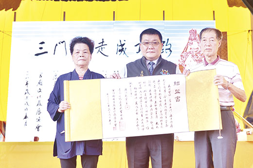 由金門地區六家媽祖宮廟組成的「金門媽祖文化發展協會」致力弘揚媽祖「立德、行善、大愛」精神,以及促進兩岸宗教文化交流活動。一項由大陸廈門朝宗宮配合二○一八海峽兩岸鄭成功文化節舉辦「三門(廈門、金門、台南鹿耳門)共走成功路」聯誼大會活動,金門媽祖文化發展協會秘書長李錫民帶領六家媽祖協會媽祖宮廟信眾人員,跨海共襄盛會;其中,李錫民代表金門縣長陳福海致贈書有「緣繫兩岸」四字中堂一幅致賀,增進兩岸宗教文化交流和情誼。 在鳳凰花紅似火的夏天裡,今年的海峽兩岸鄭成功文化節在廈門港玉沙坡揭開序幕;廈門市老港口邊上的朝宗宮配合舉辦「三門(廈門、金門、台南鹿耳門)共走成功路」聯誼大會,將媽祖文化和鄭成功文化相結合,開闢了兩岸媽祖文化交流新途徑,促進推動兩岸宗教文化的交流和往來的提升。 此次,由金門媽祖文化發展協會秘書長李錫民帶領媽祖協會六家媽祖宮廟跨海到廈門玉沙坡參加朝宗宮舉辦「三門(廈門、金門、台南鹿耳門)共走成功路」聯誼大會活動,他們是:南門天后宮、湖下雙忠廟、官澳龍鳳宮、田墩天后宮、峰上天后宮、料羅順濟宮,共襄盛會。 金門媽祖文化發展協會表示,廈門玉沙坡的朝宗宮逐漸成為兩岸民眾宗教與文化交流的重要視窗,在其聯誼大會裡有海協會原副會長張銘清、臺灣知名人士廖正豪、中華媽祖文化交流協會常務副會長俞建忠、湄洲媽祖祖廟董事會副董事長莊美華、台南正統鹿耳門聖母廟主委王明義、金門媽祖宮廟文化發展協會秘書長李錫民、三門媽祖信眾以及兩岸鄭成功廟信眾、日本、馬來西亞嘉賓共二百餘人出席盛會,並見證了三門媽祖廟締結至親的簽訂儀式。 在聯誼大會中,金門媽祖宮廟文化發展協會秘書長李錫民代表陳縣長致贈中堂墨寶一幅,祈「緣繫兩岸」及致賀大會圓滿成功。而且,在與會各界貴賓見證之下,金門媽祖宮廟文化發展協會總幹事李錫民與朝宗宮管委會主任林招治、台南正統鹿耳門聖母廟主委王明義共同簽署三門媽祖廟締結「結盟書」,將共同弘揚媽祖「立德、行善、大愛」的精神,以及鄭成功「忠貞愛國」的情操,也將開展兩岸三門之間青少年的人文交流,讓中華優秀的傳統文化代代相傳。 金門媽祖宮廟文化發展協會介紹說,三百多年前,鄭成功在廈門港玉沙坡建水操台演武練兵,並恭請三尊媽祖聖像登船護航,開啟收復臺灣偉大功績之序幕,擇於農曆三月廿三日媽祖生當天,從金門料羅灣揮軍出發,至台南鹿耳門時受媽祖神助,順利登陸鹿耳門,成功收復寶島臺灣,後將護航三尊媽祖像供奉于台南正統鹿耳門聖母廟,時至今日,信眾稱為「國姓媽」。 另,廈門港是鄭成功的發祥之地,廈門│金門│台南鹿耳門這條偉大的英雄航線被稱為「成功之路」。廈門、金門、台南鹿耳門都留存有鄭成功的歷史遺跡和深厚的媽祖文化,基於鄭成功與媽祖文化深厚淵源。因此,廈門朝宗宮發起與台南正統鹿耳門聖母廟、金門媽祖宮廟文化發展協會締結「至親廟」,共同弘揚鄭成功文化與媽祖文化。 此外,金門媽祖宮廟文化發展協會秘書長李錫民係於日前帶領媽祖協會六家媽祖宮廟赴廈門參加三門共走成功路聯誼大會,他接受當地媒體採訪時表示,兩岸神緣一脈相承,金門媽祖協會與廈門、鹿耳門媽祖廟結為「姐妹廟」更體現出兩岸媽祖文化及信仰是一脈相承的,促進了兩岸交流合作。