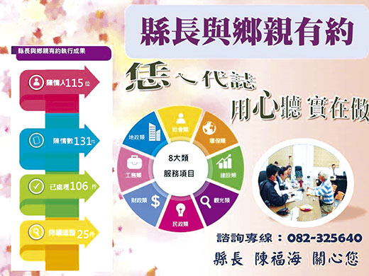 為探索民情,金門縣政府訂於7月10日下午14時在縣府大禮堂,辦理「縣長與鄉親有約」,由縣長陳福海率各局(處)暨一級機關主官(管),接受鄉親陳情及建言。 把「鄉親的事,看作自己的事」,這是陳縣長上任以來,一貫的堅持與信念,為此他多次下鄉尋訪民情,重點要求縣府施政以「民意」為優先,囑咐同仁承辦業務需「設身處地」協助鄉親解決問題,今年度決定擴大辦理「與鄉親有約」,透過各局(處)主官與鄉親第一線接觸,提供民眾陳訴及縣府蒐集輿情的管道,藉以調整施政方向,以達「施政有感」的目標。 縣府表示,「縣長與鄉親有約」系列活動,仍將安排由縣長逐一接待鄉親,聽取陳訴,現場答覆。為服務鄉親,當日採現場報到取號之方式:自七月份起,報到時間改為活動當日下午14時起至15時止,鄉親可至縣府服務台,填具服務摘要後,以報到時間,依序領取號碼牌,於受理陳情(14時)即引導入場。 如有具體訴求需縣府協助處理之案件,除現場了解意見初步回應外,將製成紀錄,會後由各業管單位,以公文書正式函復陳情人。