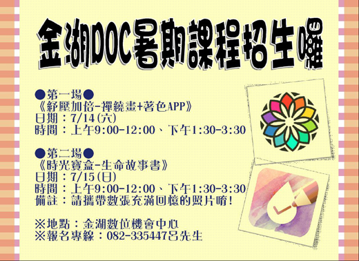 終於放暑假了,在漫長的兩個月假期當中,除了充分的休息之外,也別忘了為自己充實一下各種知識技能吧!金湖DOC數位學習中心的暑期課程招生了,將開辦「紓壓加倍:禪繞畫與著色APP」,以及「時光寶盒│生命故事書」等兩場課程。活動自即日起開放民眾報名,報名請洽:(082)335447,洽詢呂先生。 金湖DOC數位學習中心表示,由於這兩場課程的名額有限,額滿為止,請有意參加的學員請儘速報名,而這兩場課程的上課地點,則是均在金湖數位學習中心。 而兩場課程時間分別為: 第一場「紓壓加倍:禪繞畫與著色APP」,時間為七月十四日(星期六),上課時間為上午九時至十二時;下午一時三十分至三時三十分。 第二場「時光寶盒│生命故事書」,時間為七月十五日(星期日),上課時間為上午九時至十二時;下午一時三十分至三時三十分;而這項課程為製作故事書,提醒學員記得要攜帶數張自己認為充滿回憶的照片作為素材,編制屬於自己的生命故事。