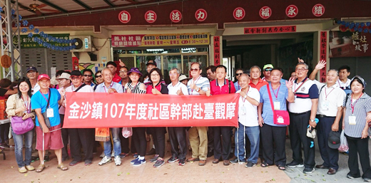 金沙鎮辦理「107年度社區幹部赴台觀摩」,由代理鎮長蔡其朝率領轄內27個社區發展協會成員計60人,赴台參訪彰化縣芬園鄉舊社社區、高雄市大寮區中興社區,與對方協會幹部、志工交流互動,也學習社區關懷照顧、社區在地身障服務等推動內容,期盼四天三夜參訪學習,能汲取其成功之經驗,作為社區未來發展之參考方向。 金沙鎮公所辦理「107年度社區幹部赴台觀摩」,金沙鎮代理鎮長蔡其朝領隊,鎮代表會副主席吳有家、鎮代表王石堆,以及轄內27個社區發展協會幹部、公所工作人員等一行約60人赴台展開四天三夜績優社區參訪活動。第一站走訪106年榮獲衛生福利部優等獎之彰化縣芬園鄉舊社社區發展協會;第二站走訪榮獲衛生福利部卓越獎之高雄市大寮區中興社區發展協會。 一行人首站抵達彰化芬園鄉,受到鄉長洪慶章及舊社社區幹部等歡迎,雙方除互贈紀念品也進行互訪交流。社區理事長,同時也是大埔村村長張凰鳳分享社區推動關懷據點、環境綠美化、社區產業、家暴防制計畫等,以及社區志工發揮自助及互助精神「人人有事做,事事有人做」等服務熱忱。 第二站走訪榮獲衛生福利部卓越獎之高雄市大寮區中興社區發展協會。根據社區發展協會理事長王英美介紹,社區早期為眷村,社區人口結構中老人人口約占12%,雖社區活動中心建於窄巷內,但社區居民鄰里互動熱絡,樂於參與各項活動。 蔡其朝表示,感謝舊社社區發展協會、中興社區發展協會幹部、志工們,熱情接待並大方分享社區關懷照顧等的推動經歷,都是金沙鎮各社區學習的對象,也希望金沙鎮各社區透過觀摩交流,汲取及學習參訪社區之優點,融入社區,提供社區更好的服務,打造宜居、活力的優質的社區。最後,鎮長也力邀對方蒞臨金門參加金沙鎮10月份之高粱、老街、風獅爺文化季系列活動。