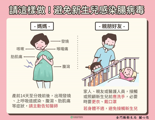 近期國內陸陸續續出現了新生兒感染腸病毒併發重症的個案產生,為此,金門縣衛生局特別提出呼籲,請準媽媽們以及照顧者,務必要加強並且留意個人的衛生,同時留意自身以及嬰幼兒健康。 依據衛生福利部疾病管制署的數據統計指出,今(一○七)年全國截至七月四日為止,目前累計有十八例的腸病毒併發重症病例,其中有八例為新生兒(含四例死亡);金門縣於今(一○七)年雖無重症確診個案,但是接獲的通報輕症個案也達到一百七十人,停課班級有三十一個班級,受到停課影響的人數則有七百零六人。 金門縣衛生局表示,有鑒於近期台灣地區陸續出現了新生兒感染腸病毒,以及有死亡的個案,衛生局配合疾病管制署,已經於六月十九日以及六月二十二日兩天,分別前往轄區內的小家秝托嬰中心,以及衛生福利部金門醫院等單位,進行腸病毒感染管制無預警查核以及輔導,查核結果「皆符合規定」。 針對腸病毒之疫情的預防,衛生局特別呼籲,新生兒可能藉由產前、生產過程或是出生後的人際接觸等途徑而感染到腸病毒,一般新生兒於出生後一至十四天發病,感染症狀從發燒、活力不佳、食慾降低等輕症,到腦炎、肺炎、多重器官衰竭等重症都有可能會發生。 此外,衛生局也提醒準媽媽們,於產前十四天至分娩後,如有發生發燒、咳嗽、喉嚨痛、腹瀉、肋肌痛等症狀,應該要主動告知醫師身體狀況;另外,家中成人或是幼兒等接觸者,則應該要落實以肥皂勤洗手,必要的時候,還請記得要更衣、戴口罩,另外如果有身體不適的狀況產生,則是應該要避免接觸到新生兒,以降低病毒傳播的風險以及可能性。對於腸病毒預防與治療,民眾若是有任何的疑問,建議可以到疾病管制署全球資訊網(http://www.cdc.gov.tw)查詢相關資訊,或是撥打免付費的疫情通報、諮詢專線1922來進行詢問通報,也可以撥打金門縣衛生局諮詢專線:330697轉612,洽詢陳小姐。