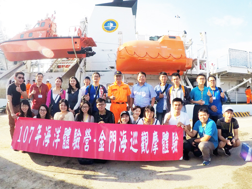 海洋委員會海巡署今年再度規劃「107年暑期大專青年海洋體驗營」,4日至6日假金門地區辦理「金門海巡觀摩體驗」,大專青年搭乘1000噸級苗栗艦往返台金,在三天兩夜的活動中,近距離觀摩海巡勤務,搭乘巡防艇至大膽島海域巡禮,深刻感受海、岸巡於海防第一線執法現況,也接受金門戰地文化洗禮,期藉以喚起青年學子守護海洋意識,及體認海洋權益與保育之重要性。 「金門海巡觀摩體驗」由海巡署中部分署及金馬澎分署共同主辦,與會大專青年4日下午2時許搭乘1000噸級苗栗艦抵達金門水頭港,展開3天2夜的活動,在海巡署金馬澎分署第九岸巡隊引導下,實地觀摩海巡艦艇執勤情形,金門料羅商港拆檢貨物、水頭通關中心小三通勤務、新湖漁港安檢勤務等,搭乘巡防艇至戰地前線之大膽島海域巡禮,同時也走訪莒光樓、獅山砲陣地、馬山觀測所等並前往水產試驗所參訪,藉以了解海防第一線人員於海域周邊執法現況,體驗金門戰地文化,也喚起學員守護海洋意識、深刻體認海洋權益與保育的重要性。活動於中午12時圓滿結束,學員也於水頭商港搭乘1000噸級苗栗艦返航。 海巡署金馬澎分署第九岸巡隊表示,期藉以讓大專青年了解海巡署「護永專案」政策,彰顯國家主權,維護漁權,以及平時金門海域駐島之海巡人員執行擴大掃蕩越界捕魚之外籍漁船等勤務,展示海巡弟兄守護藍色國土的決心與能量,也期盼學員透過活動親身體驗感受海洋生態與海洋資源之珍貴與重要性,並能提升莘莘學子對國土疆域及海洋國家之意識與認同。