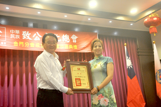 李金鎗/圖文 社團法人中華民族致公文化總會第一屆金門分會成立大會暨授證儀式昨日舉行,由總會長陳柏光主持授證,計有會長羅建華、副會長段國安、執行長楊玉璽、榮譽會長李應文、彭火興、總顧問李錫瑜、顧問王國代、洪美榮、古士明。到場祝賀嘉賓有縣長陳福海、國民黨金門縣黨部主委林芳旋、縣議員洪允典、李應文、李誠智、金城鎮代表會主席陳天成、代表李錫瑜、倪于媃等。縣長陳福海感謝陳總會長對推動兩岸和平發展基礎貢獻心力,多年來促進兩岸和諧,融合兩岸發展。並表示兩岸一家親,在兩岸目前緊張的氛圍,金門更應該扮演關鍵角色,兩岸的融合才有幸福的台灣與金門。