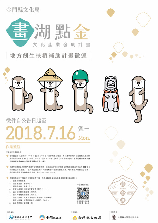 金湖地區店家有福了!金門縣文化局自即日起舉辦「畫湖點金文化產業發展計畫—地方創生扶植補助計畫徵選」廣邀民眾發揮創意、大膽提案,每案補助金額最高可達新台幣15萬元整。 金門縣文化局為扶植在地文化產業、提昇產值潛能與品牌競爭力,促進地方文化品牌建立與加值應用,特別辦理「畫湖點金文化產業發展計畫—地方創生扶植補助計畫徵選」,並於7月9日(星期一)下午2時,假金湖鎮山外社區發展協會(891金門縣金湖鎮中正路26號)辦理徵件說明會,讓民眾更了解計畫內容,更希望透過補助計畫,讓創意能夠具體展現。 補助對象為設在「金湖地區營業在地店家」,提案內容則需符合金門或金湖意象如重要地標、風土民情、自然生態等之特色商品、品牌形象等。徵選時間自即日起至7月16日(星期一)下午5時止,歡迎文化業者或有興趣之個人、團體踴躍提案、秀出創意讓大家認識不一樣的金湖。 詳細徵選計畫及內容可至臉書下載,請於臉書搜尋「畫湖點金文化產業發展計畫-遊金湖」,申請方式請於徵選期間內親送或郵寄至金門地方創生諮詢推動辦公室(89141金門縣金湖鎮山外里山外501號),外封套請註明「『畫湖點金文化產業發展計畫』地方創生扶植徵選」字樣,若有其他疑問請洽0935962902楊小姐。