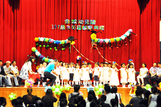 金城幼兒園107級第56屆210位應屆畢業生畢業典禮(如圖),昨日晚間六時起在城幼活動中心溫馨、熱鬧舉行,在各界貴賓和師長、畢業生家長祝福下,小小畢業生即將走出校園,踏入國小校門展開另一階段學習旅程。 金城幼兒園應屆畢業生畢業典禮,昨日上午在學校活動中心舉行畢業成果發表和畢業摸彩活動。晚間六時起則有畢業生校園巡禮及頒獎績優,園長許碧華溫馨祝福和來賓致詞鼓勵。 包括教育處副處長陳家輝、科長葉麗珠、縣議員陳滄江、金城鎮長石兆瑉、金城鎮民代表會主席陳天成、金沙國中校長王任益、古寧國小校長黃芸芸、古城國小校長楊成業、何浦國小校長曾秀玲、金城幼兒園家長會長王林斌、副會長王中聖、總幹事吳伯揚等,以及學生家長踴躍到場參與。 許碧華園長表示幼生在師長教導下學習得更懂事、勇敢、獨立,也期許小朋友養成良好運動和閱讀習慣,不沉溺於3C產品,並培養良好品德,更能懂得感恩惜福,將來做個有用的人。 教育處副處長陳家輝、議員陳滄江、鎮長石兆瑉、主席陳天成,也語多祝福和嘉勉。希望小朋友多運動和不斷學習,並懂得感恩父母和師長,學習尊重別人。陳家輝也表示,教育處和金城幼兒園將持續努力,以使幼兒園後面擴建校地,城幼未來有更優質學習環境。而連續三年十一個月零八天,擔任城幼陪小朋友過馬路的保全志工的「江哥」爺爺陳滄江,也以自己目前還沒有孫子,但看到小朋友像小天使、小蝴蝶一樣快樂上學,自己心中也很快樂。
