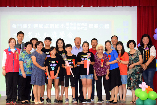 卓環國小106學年度國小部暨幼兒園畢業典禮(如圖),昨日溫馨舉行,烈嶼鄉長洪成發、縣府教育處長李文良、鄉代會主席洪若珊、副主席洪燕玉等各界來賓到場祝福31位小朋友完成國小及幼兒園階段的學業。身兼卓環國小校友會理事長的洪成發,也捐出三萬元來贊助畢業活動經費,圓滿活動,讓畢業生和家長留下美好的回憶。 畢業活動於昨日上午九時在學校的活動中心舉行,校長余鳴和師生歡迎烈嶼鄉長洪成發、縣府教育處處長李文良、副處長陳家輝、鄉代會主席洪若珊、副主席洪燕玉、鄉代表方水萬、陳秀治、方駿洋、洪雅明、吳福全、國民黨烈嶼鄉黨部主任林宜蘭、立委楊鎮浯服務處主任洪學文、縣府烈嶼服務中心主任洪植芳、學校校長等各界來賓和家長的參與。 鄉長洪成發、教育處處長李文良、鄉代會主席洪若珊、副主席洪燕玉應邀頒獎獎勵各學習領域優秀的畢業生,語多勉勵學子們踏入新學習階段,繼續努力學習,為未來奠下根基。烈嶼慈幼關懷協會會長余平禧頒發該會獎助學金予得獎學生,期許他們繼續在國中階段的學習,有更好的表現。 熱心教育的鄉長洪成發,回饋卓環母校,在母校慶祝建校五十週年校慶,響應校友發起籌募校友會的基金,個人捐出新台幣廿萬元,來挹注校慶活動,也作為未來協助母校校務發展的基金。昨日,也再捐出三萬元來贊助這一次畢業活動的聯誼餐會以及活動費用,表達祝福之意。 校長余鳴也以十六字箴言「人心惟危」、「道心惟微」、「惟精惟一」、「允執厥中」,勉勵師生做個行正道的「人」。余鳴說,學校教育要多元而平衡,惟有教做人(品德教育)又教做事(才學知能)齊頭並重,才能符合現今的教育目標。 六年級導師洪筱媛投入很多心力教導學生,師生間良好的情誼。透由影片來回憶校園點滴的生活,畢業生回憶馬上湧現,和導師離情依依,多位女學生熱淚盈眶的場景,流露出師生亦師亦友的真摯情感。 活動中也安排有學生才藝表演節目,畢業生也向師長們獻花,感謝老師的教導。